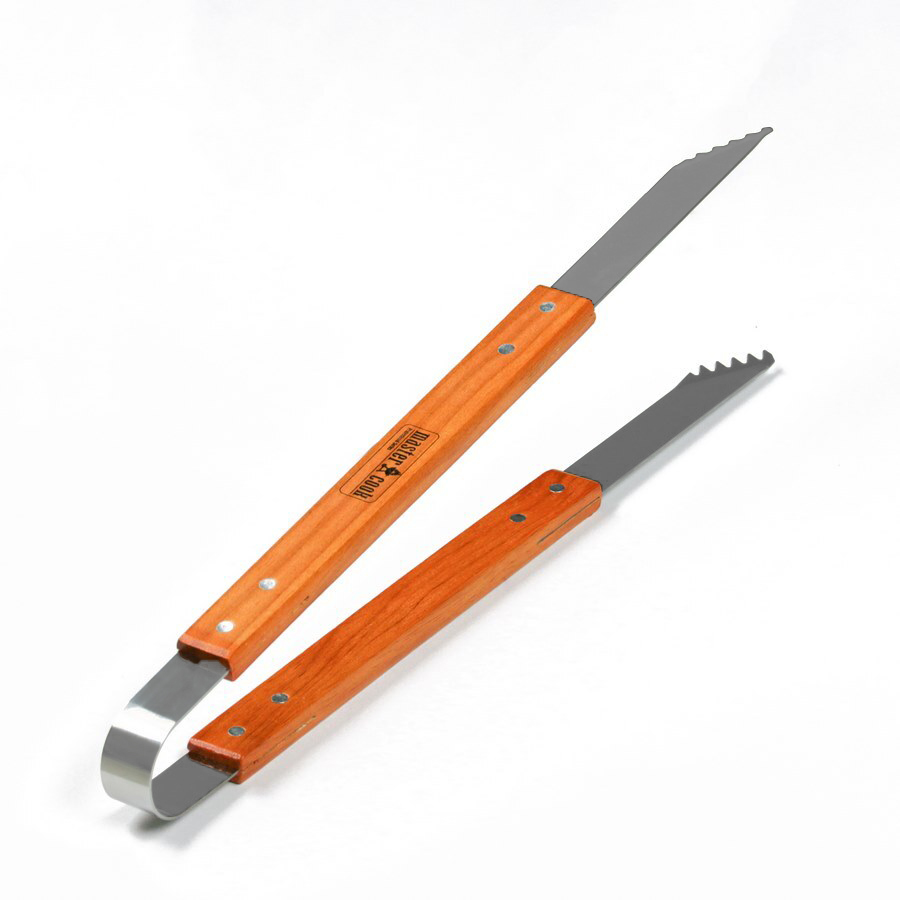 Set barbecue da 3 pezzi composto da: forchettone (45,8x3,7 cm), pinza (46x2,7 cm) e spatola (48x10 cm). Manico in legno e struttura in acciaio inox 430.