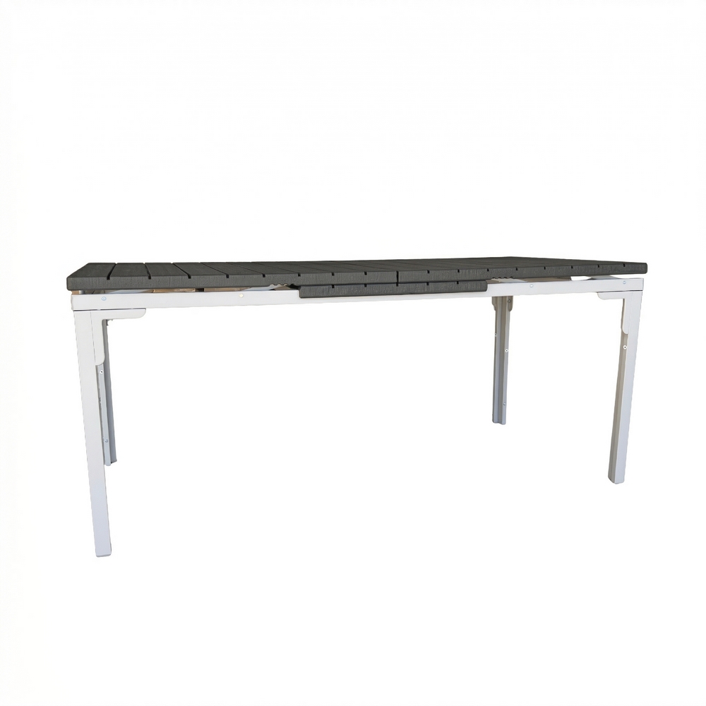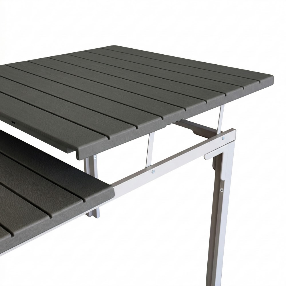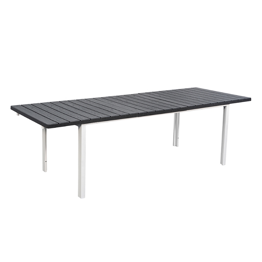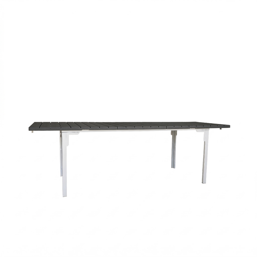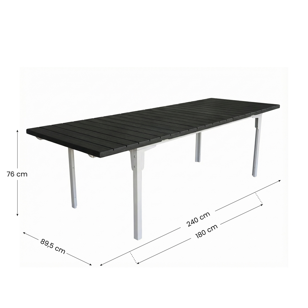 Tavolo estensibile in resina HDPE colore grigio. Dimensioni (LxPxA): 180-240x89,5x76 cm. Struttura metallica verniciata a polvere, top in resina anti UV.