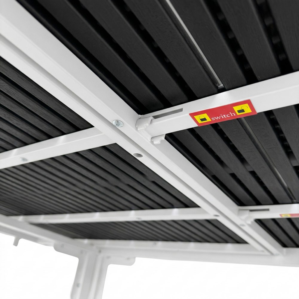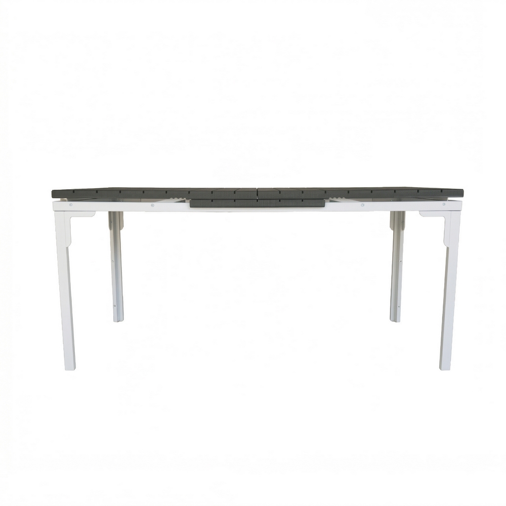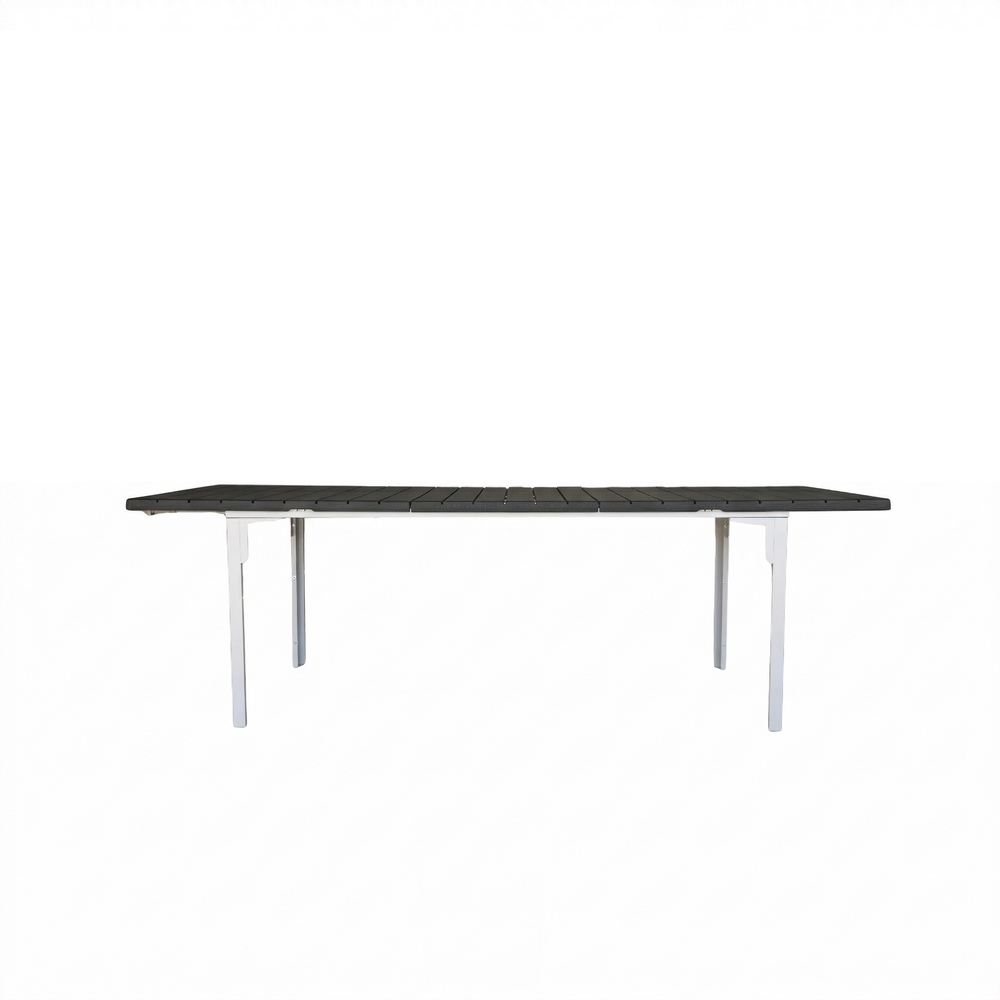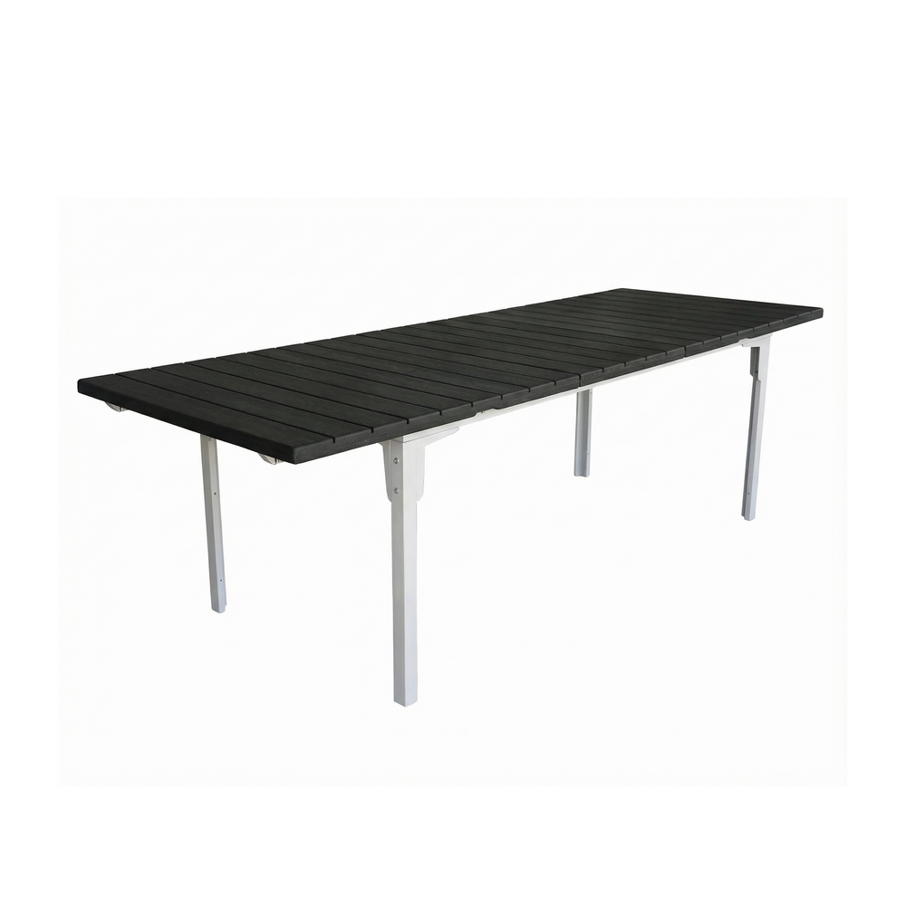 Tavolo estensibile in resina HDPE colore grigio. Dimensioni (LxPxA): 180-240x89,5x76 cm. Struttura metallica verniciata a polvere, top in resina anti UV.
