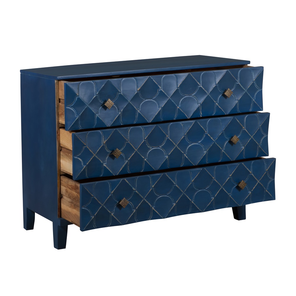 Cassettiera 3 cassetti in legno di mango blu, cassetti intarsiati e top finitura naturale. Dimensioni (LxPxA): 110x48x85 cm.