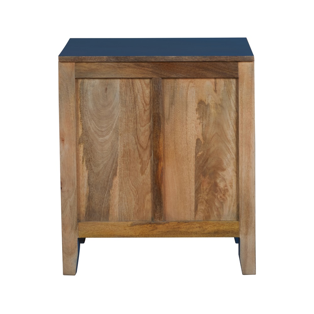 Cassettiera 3 cassetti in legno di mango blu, cassetti intarsiati e top finitura naturale. Dimensioni (LxPxA): 60x40x70 cm.