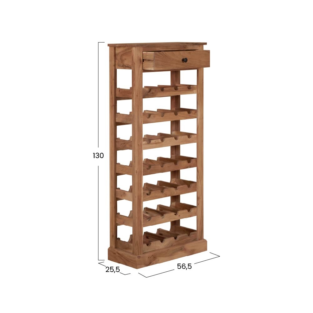 Cantinetta portabottiglie in legno di mango con cassetto dotata di 7 ripiani. Finitura naturale. Dimensioni (LxPxA): 56,5x25,5x130 cm.