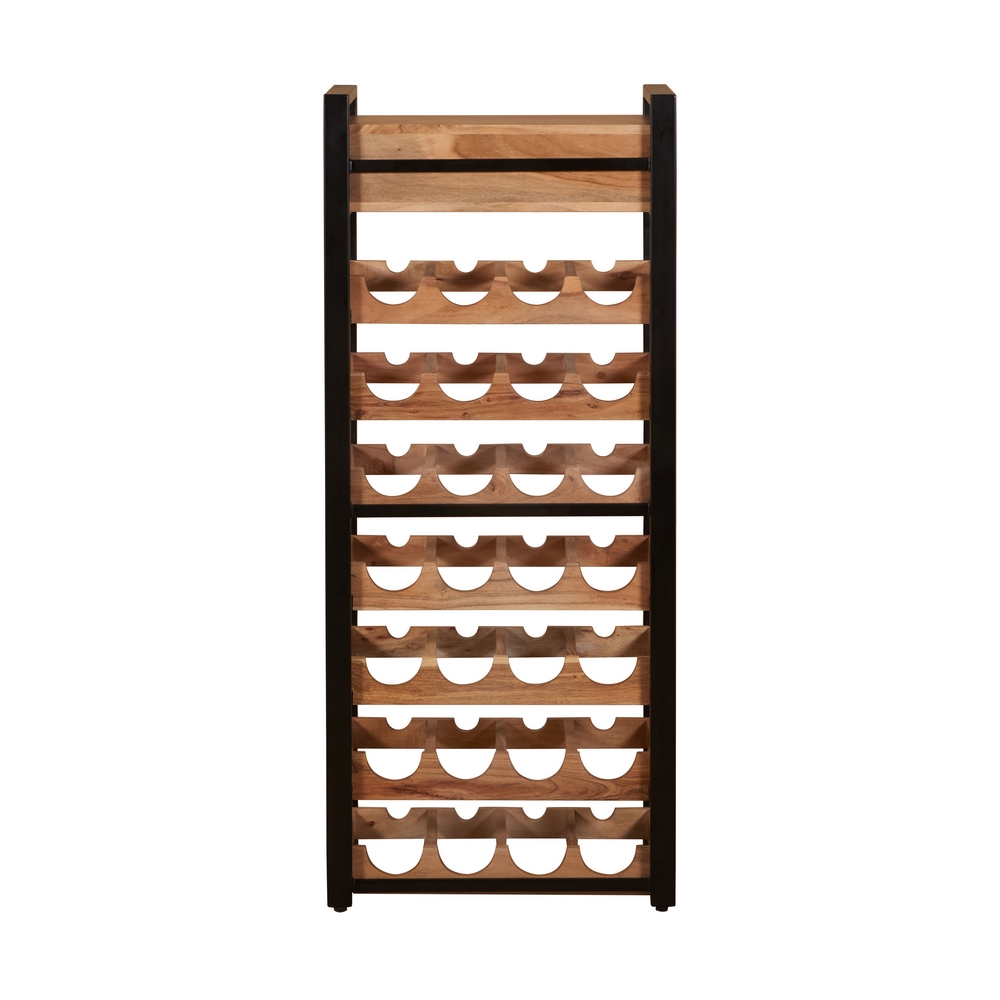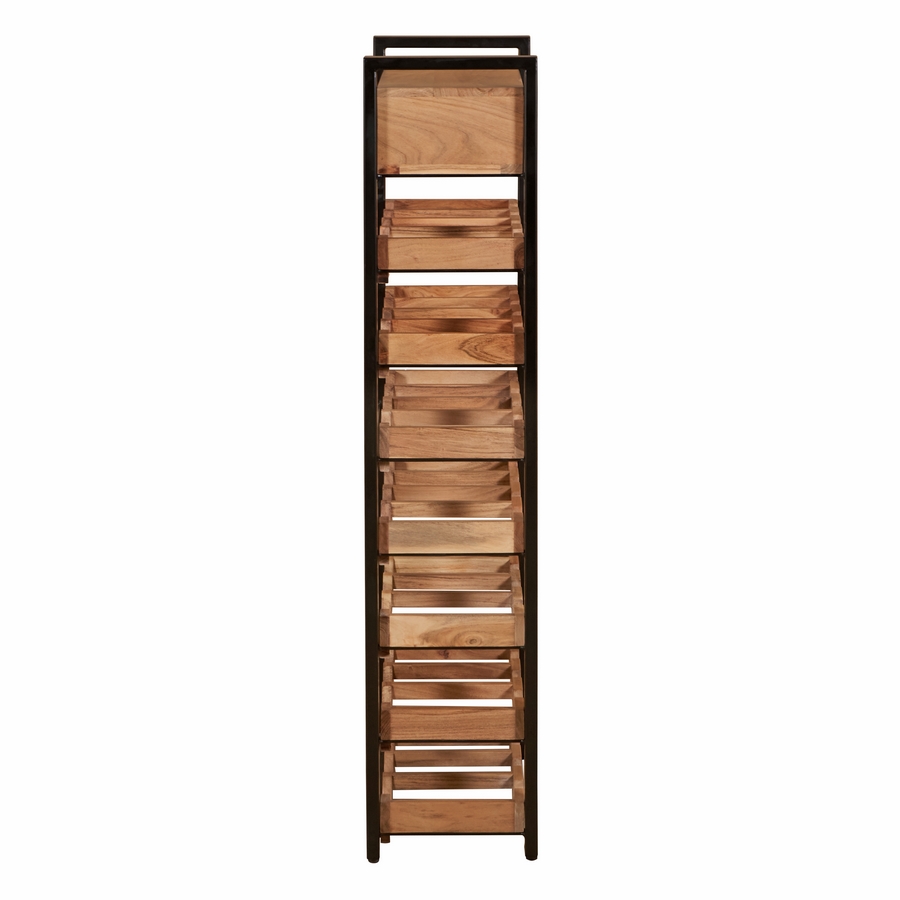 Cantinetta portabottiglie in legno di mango con cassetto dotata di 7 ripiani. Finitura naturale e profili laterali neri. Dimensioni (LxPxA): 56,5x25,5x130 cm.