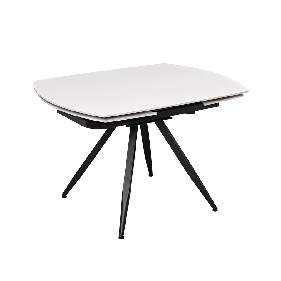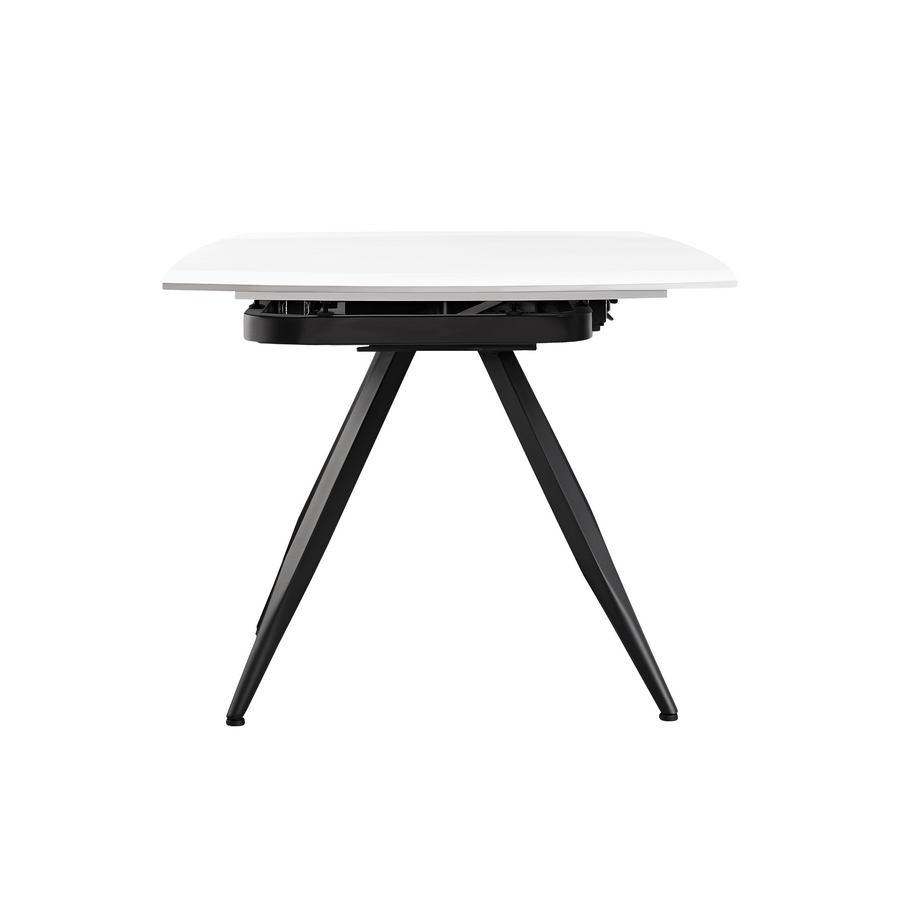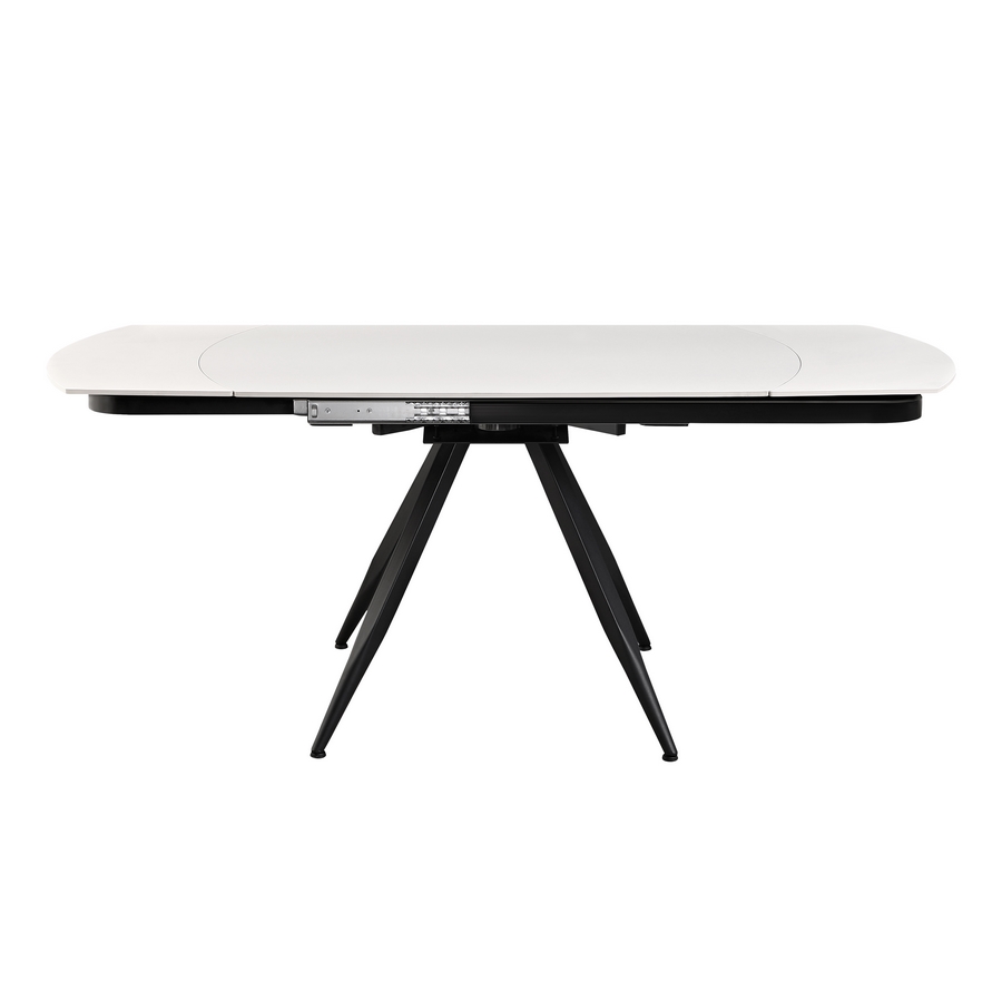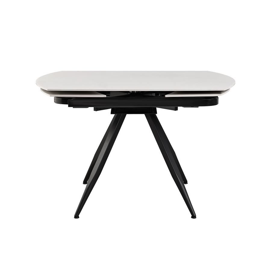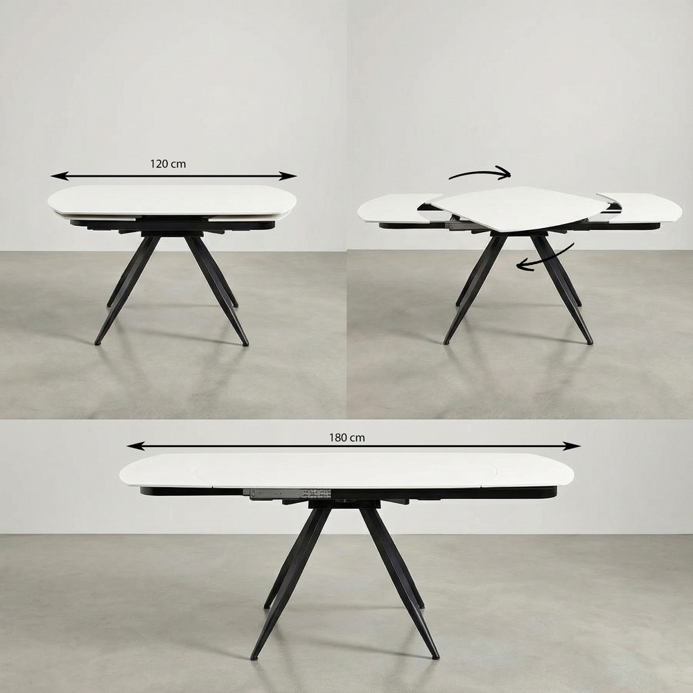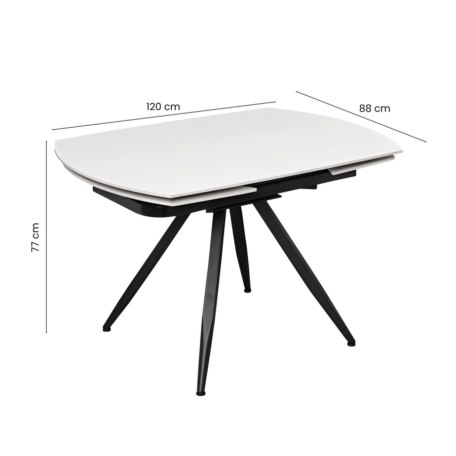 Tavolo da pranzo allungabile top in ceramica color bianco crema. Dimensioni (LxPxA): 120-180x88x76 cm. Top Sp. 12 mm, gambe in metallo nero verniciato a polvere 50x1,2 mm.
