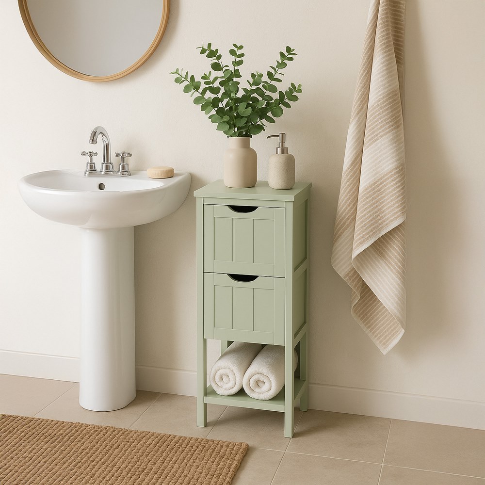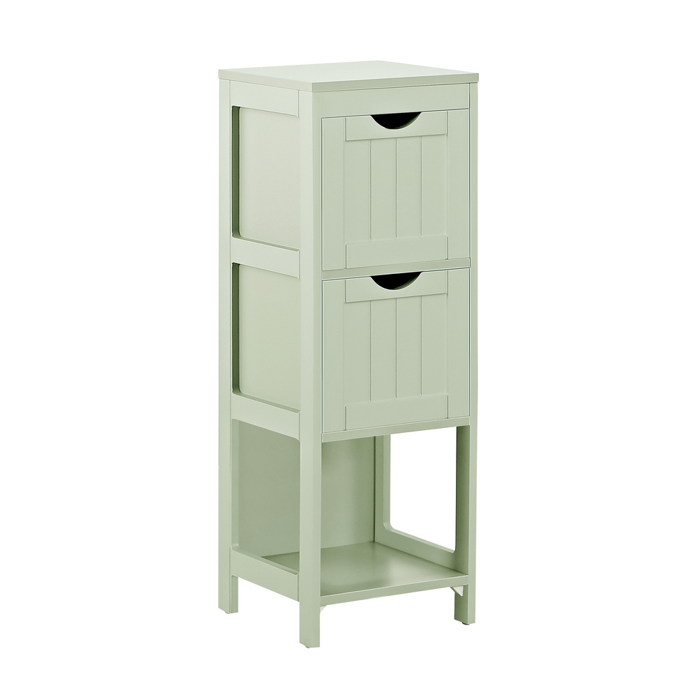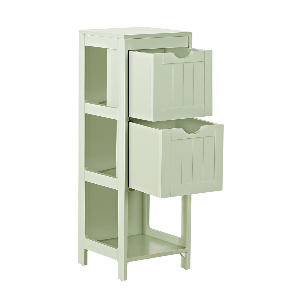 Mobiletto colonna da bagno a 2 cassetti movibili e 1 scomparto aperto salvia. Dimensioni (LxPxA): 30x30x89cm. Struttura in legno MDF e pannelli in truciolato Sp.15mm. Cassetto (LxPxA): 26,5x28,5x24 cm.