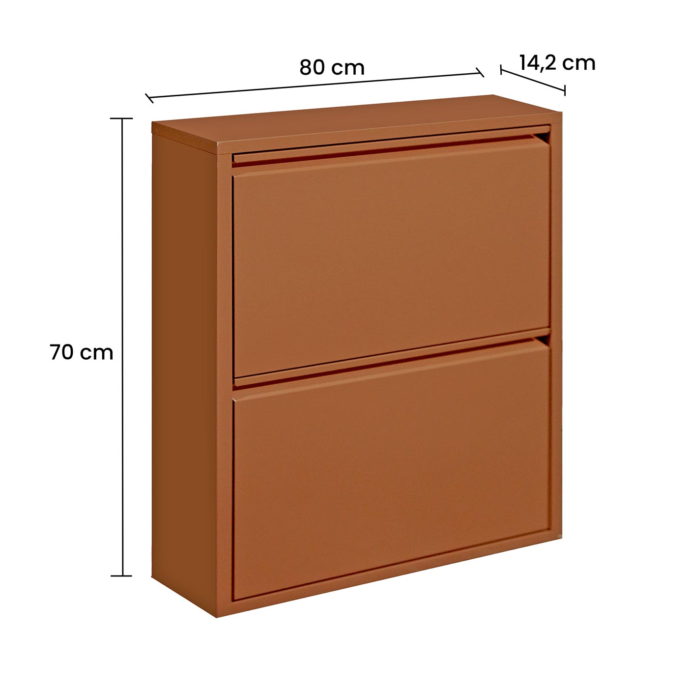 Scarpiera metallica, 2 ante a ribalta color mattone (Pantone 4262C). Dimensioni (LxPxA): 80x14,2x70,5 cm. Prodotto assemblato.