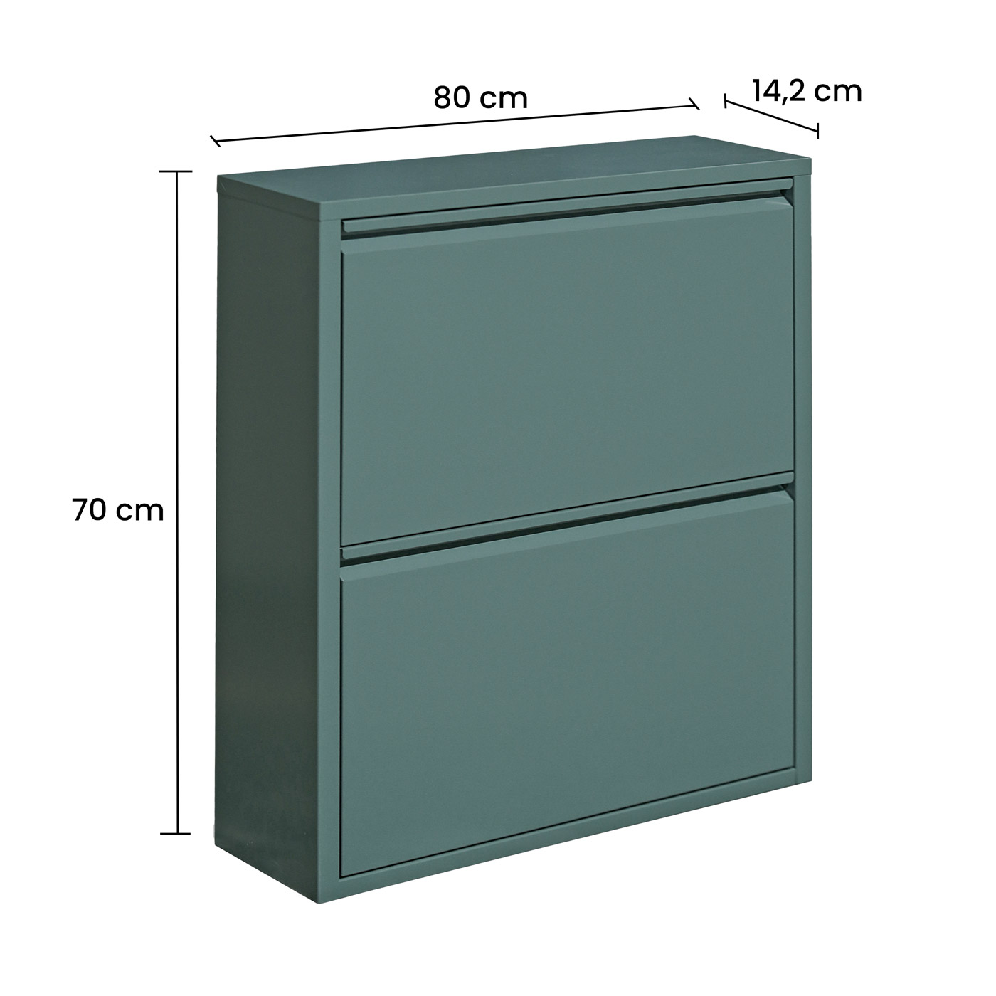 Scarpiera metallica, 2 ante a ribalta colore verdone (Pantone 2463C). Dimensioni (LxPxA): 80x14,2x70,5 cm. Prodotto assemblato.