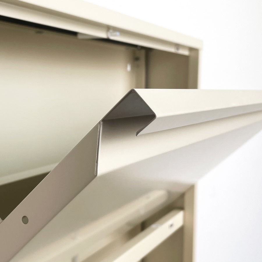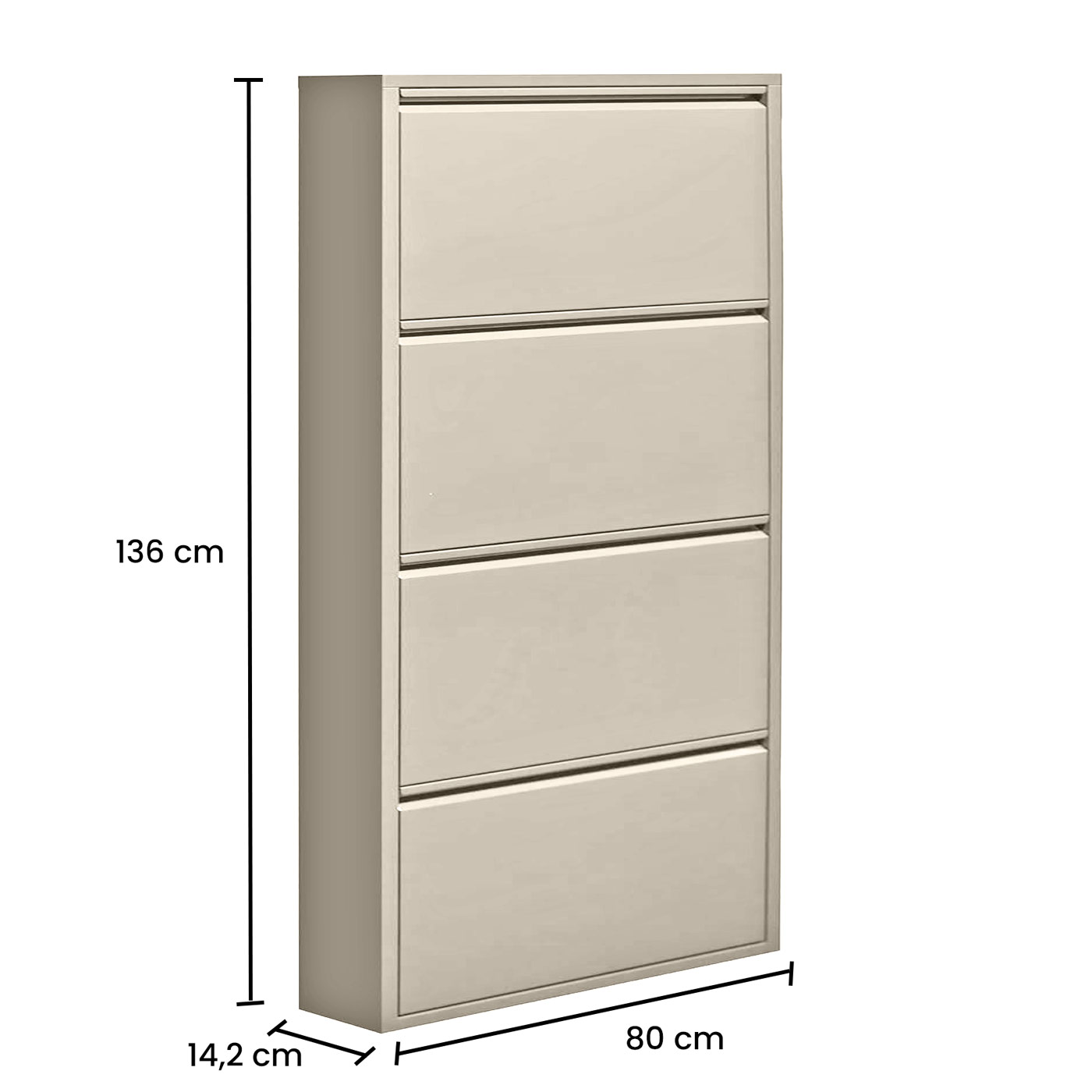 Scarpiera metallica, 4 ante a ribalta color avorio (Pantone 7527C). Dimensioni (LxPxA): 80x14,2x136 cm. Prodotto assemblato.