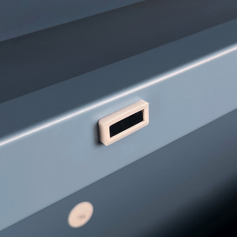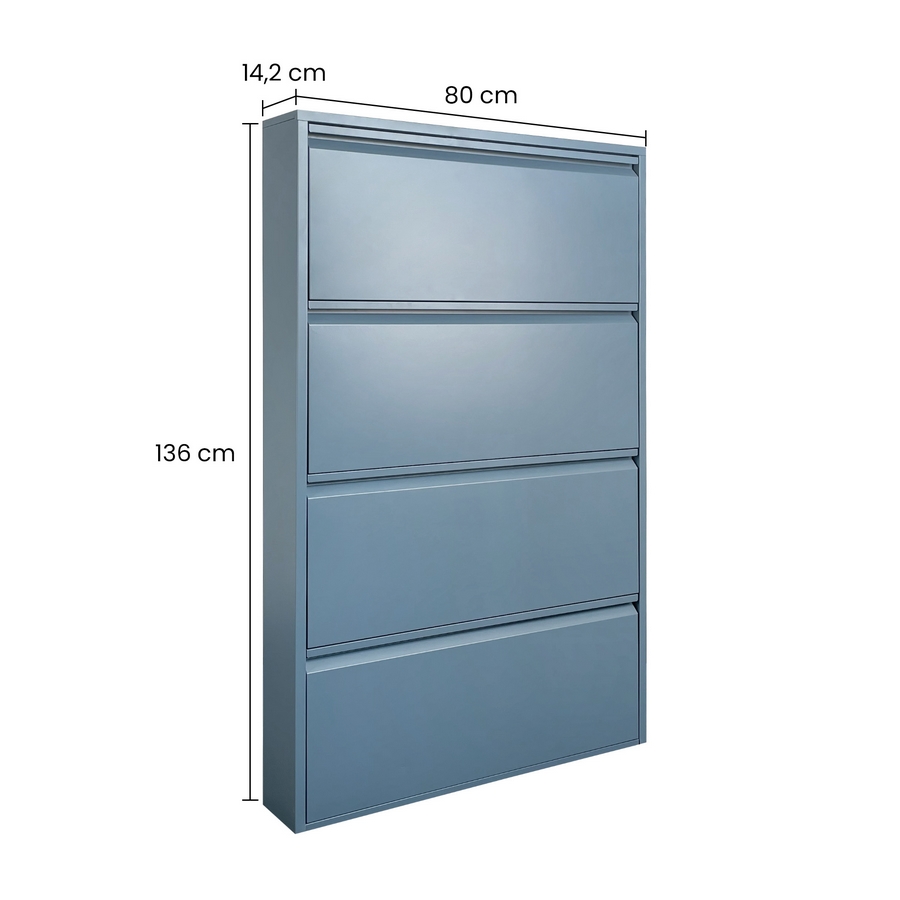 Scarpiera metallica, 4 ante a ribalta colore ceruleo (Pantone18-4221 TCX). Dimensioni (LxPxA): 80x14,2x136 cm. Prodotto assemblato.
