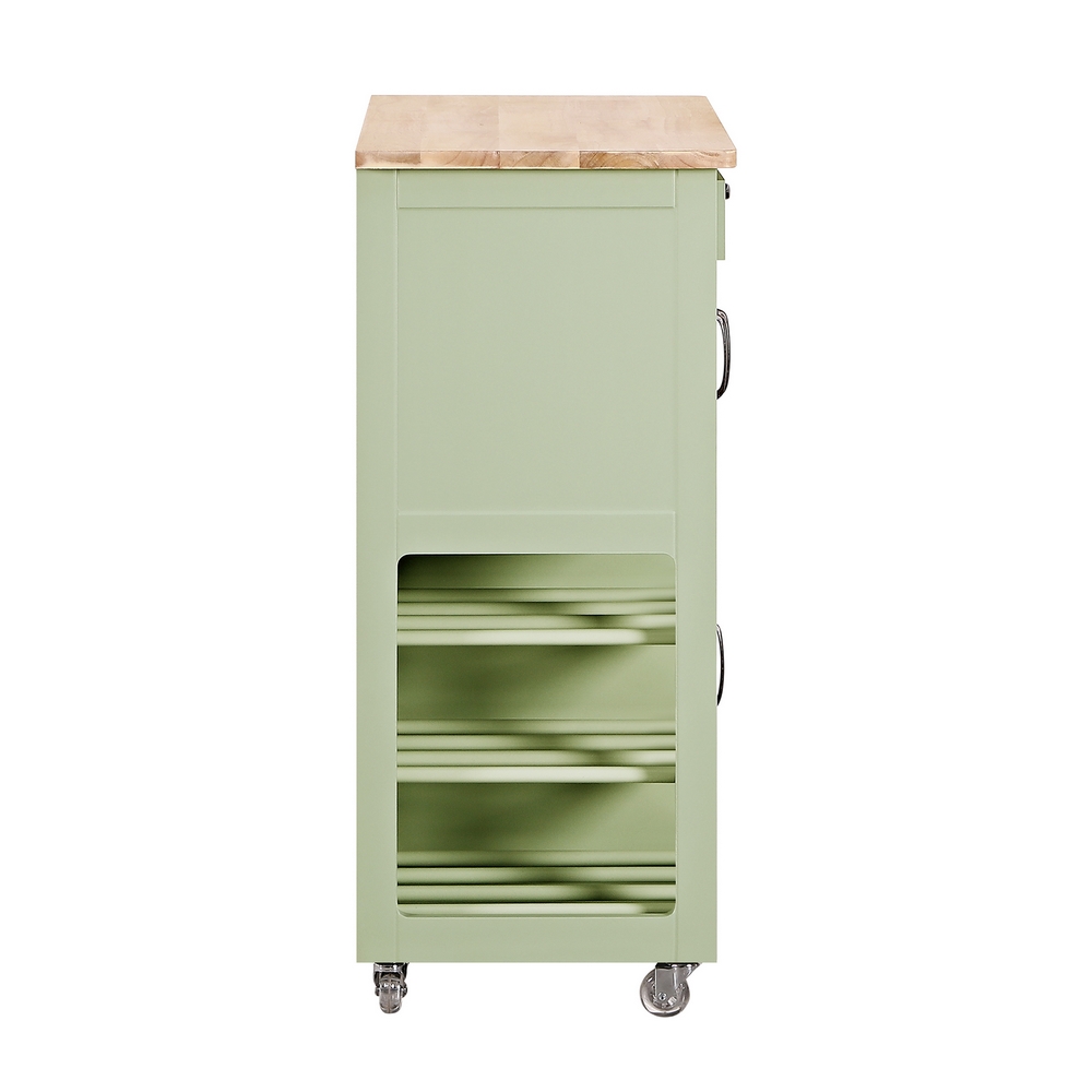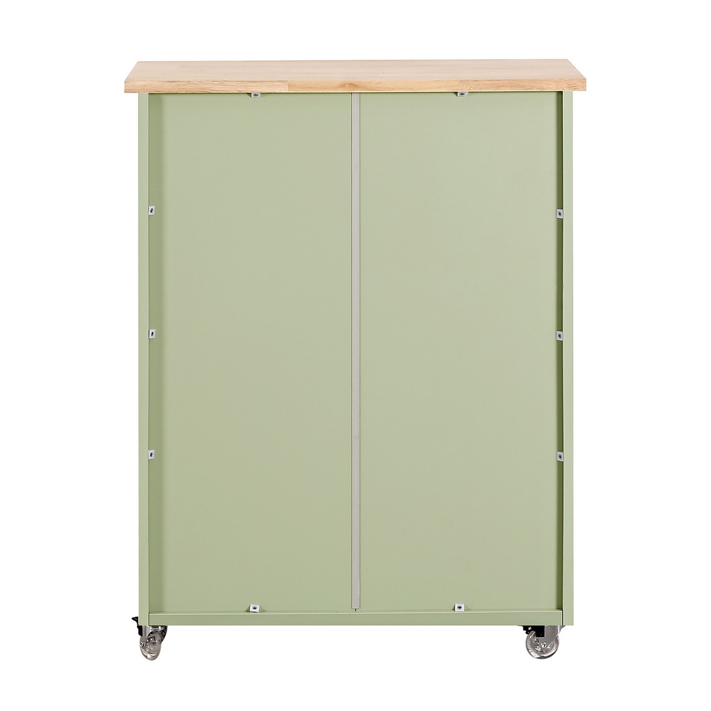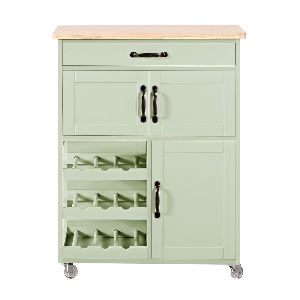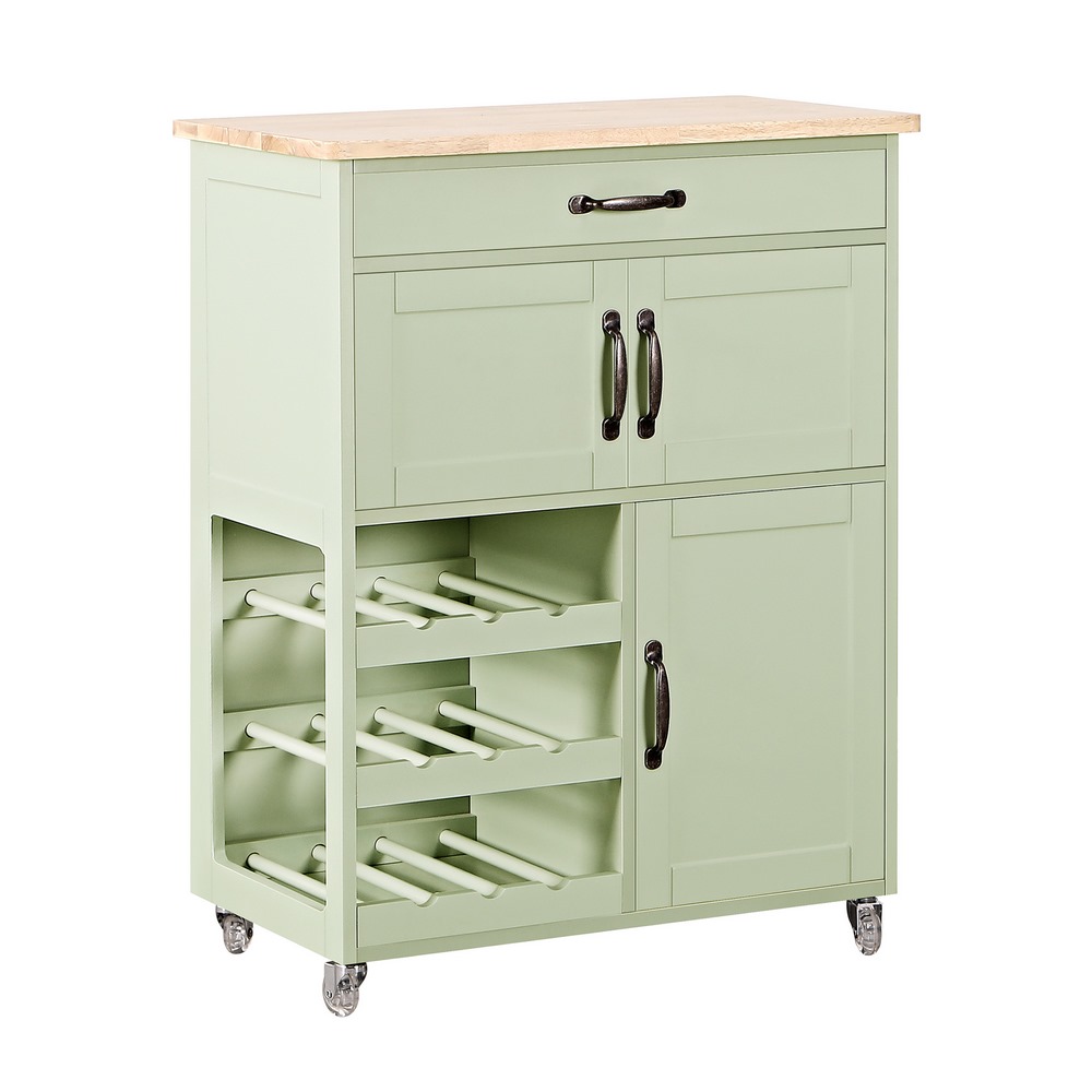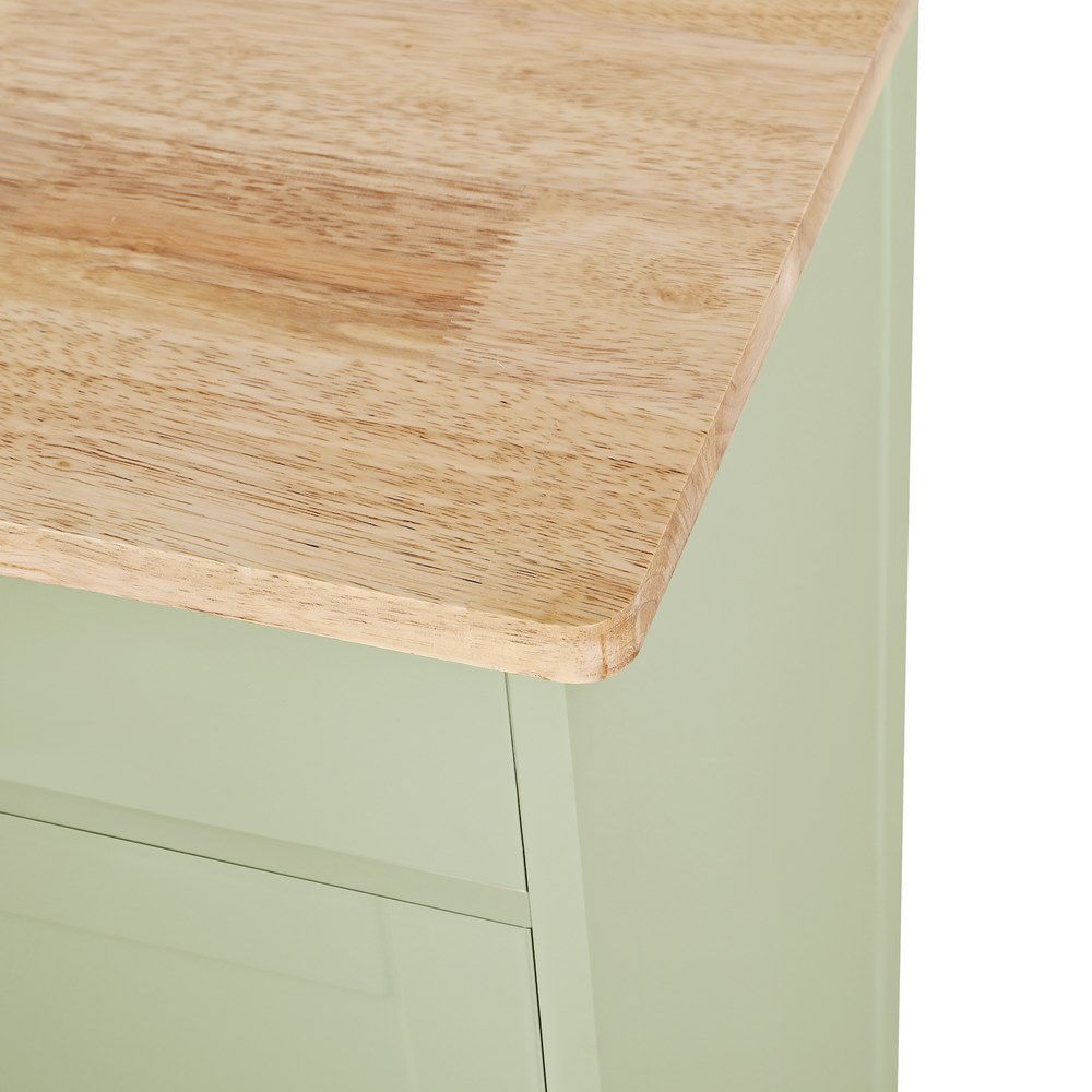 Credenza salvia con Top in legno di gomma color naturale Sp. 18 mm. Dimensioni (LxPxA): 67x36x87 cm. Struttura in MDF Sp. 15 mm: 1 cassetto, 2 cassettoni, 1 anta e 3 portabottiglie. Perfetto come mobile cucina/dispensa.