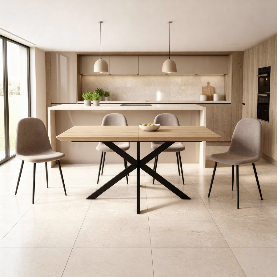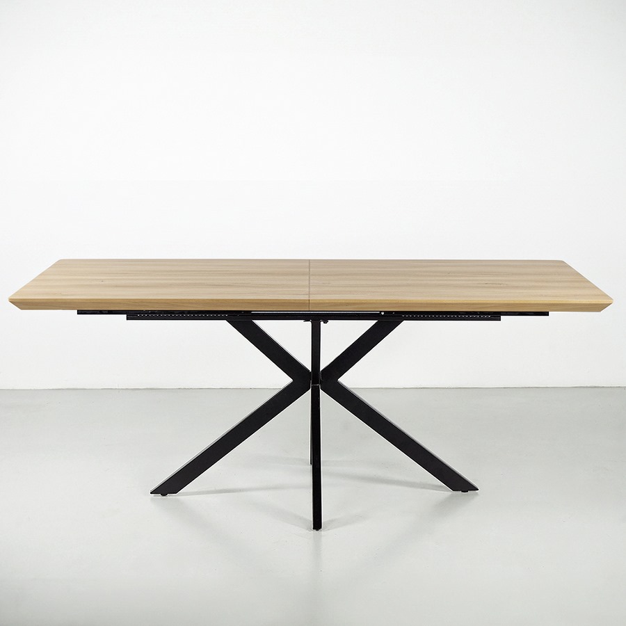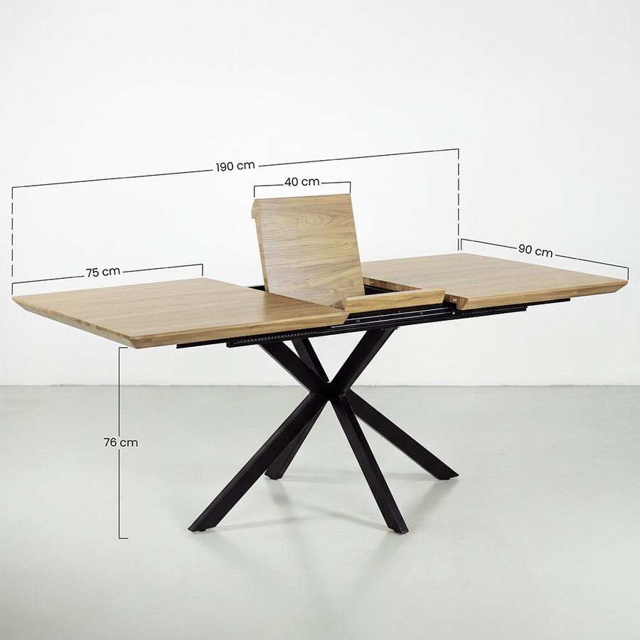 Tavolo da pranzo allungabile in legno MDF effetto rovere chiaro Sp. 18 mm. Dimensioni (LxPxA): 150-190x90x76h cm. Gambe con struttura tubolare quadrata nera 30x60mm, Sp. 1,2 mm.