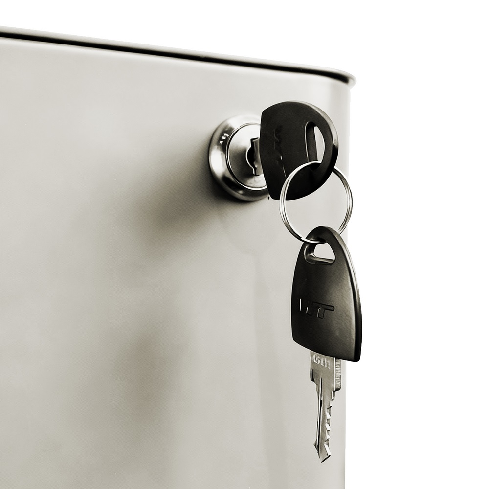 Due cassetti portapenne + un cassetto portadocumenti. Scatola portapenne in plastica + divisorio portadocumenti. Serratura centrale con due chiavi e cinque ruote.