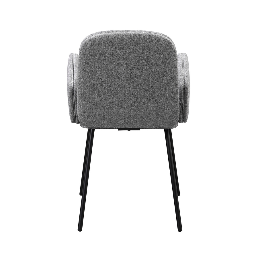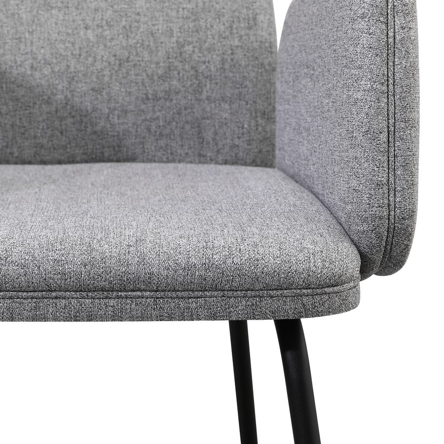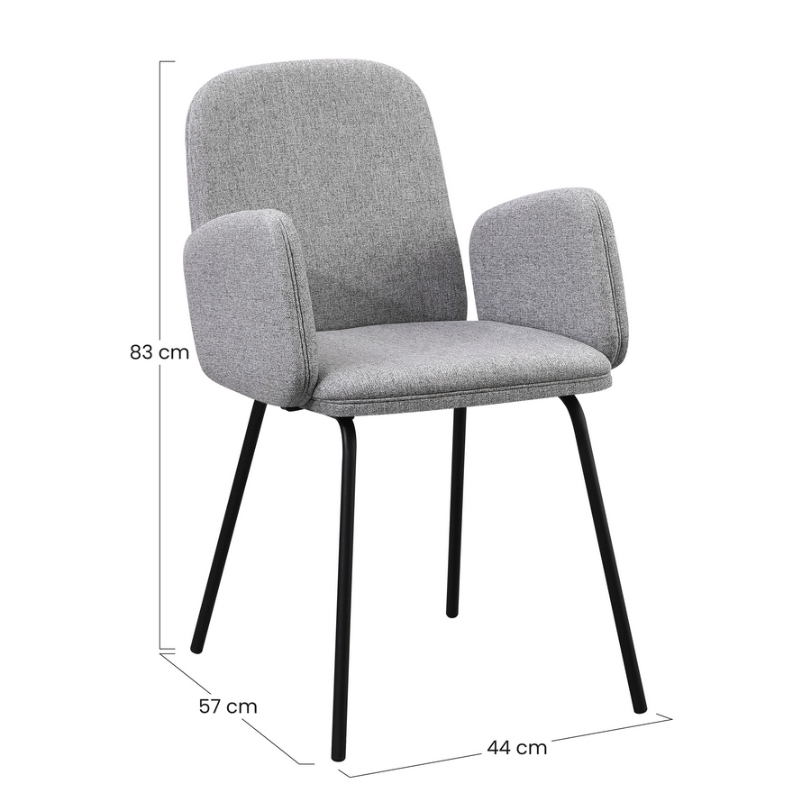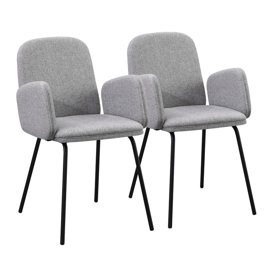 Set 2 sedie con braccioli in tessuto grigio chiaro. Dimensioni (LxPxA): 44x57x83 cm. Gambe metalliche nere 16x1,2 mm.