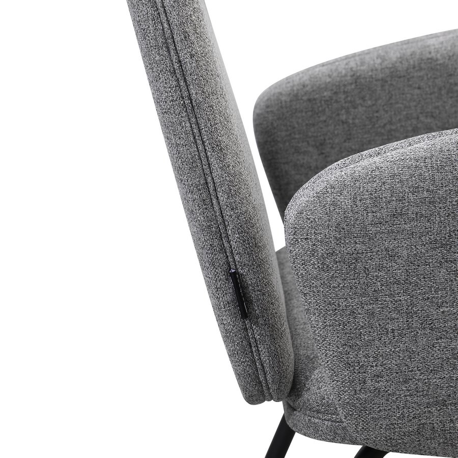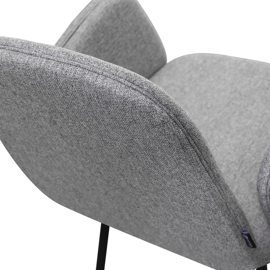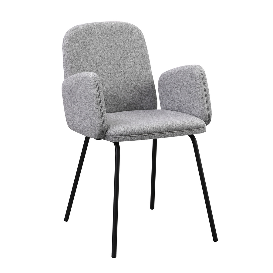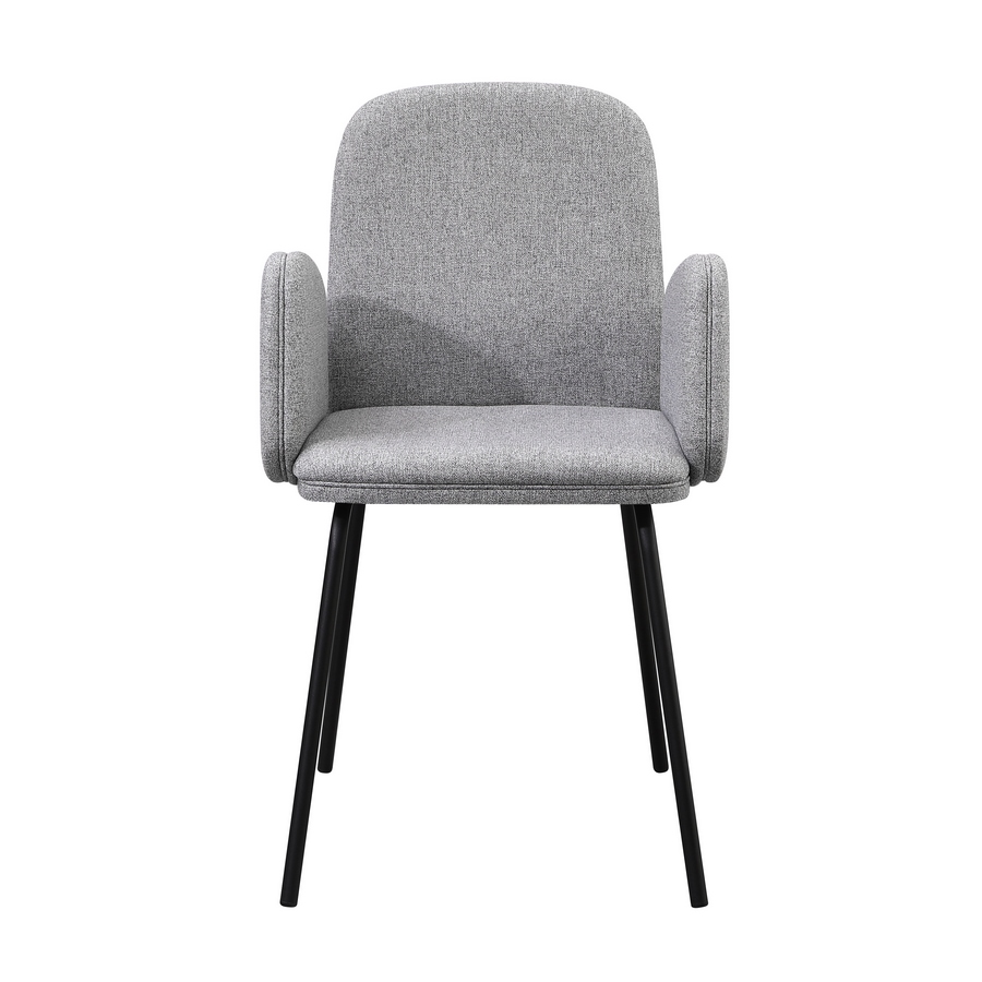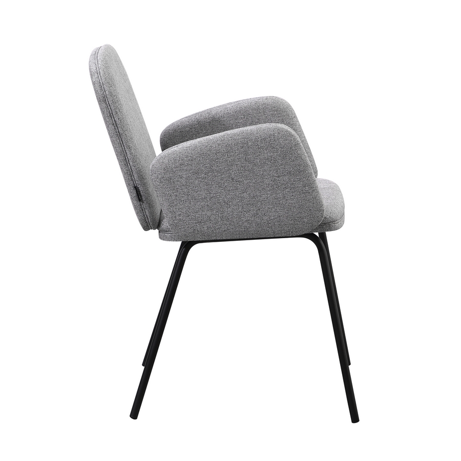 Set 2 sedie con braccioli in tessuto grigio chiaro. Dimensioni (LxPxA): 44x57x83 cm. Gambe metalliche nere 16x1,2 mm.
