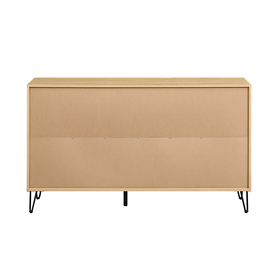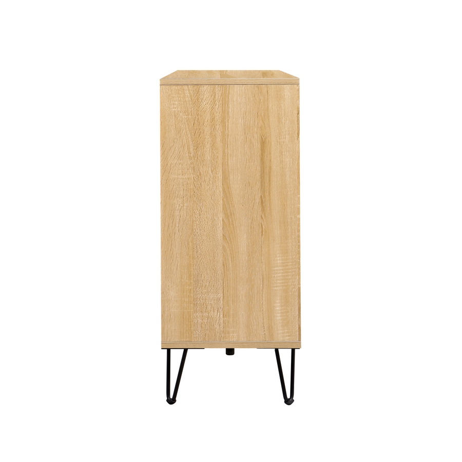 Credenza 3 ante con ripiano interno e 3 vani a giorno, colore rovere e bianco. Dimensioni (LxPxA): 142x35,6x83 cm. Materiale legno melaminico Sp.15 mm. Gambe metalliche, maniglie in lega di alluminio.