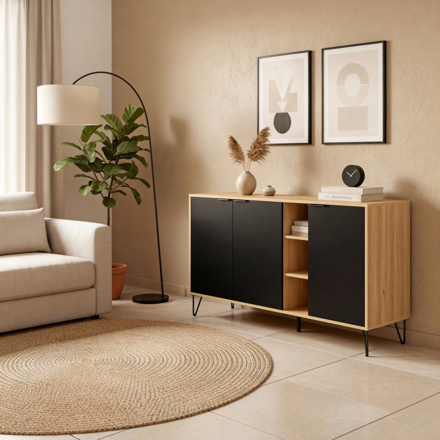 Credenza 3 ante con ripiano interno e 3 vani a giorno, colore rovere e nero. Dimensioni (LxPxA): 142x35,6x83 cm. Materiale legno melaminico Sp.15 mm. Gambe metalliche, maniglie in lega di alluminio.