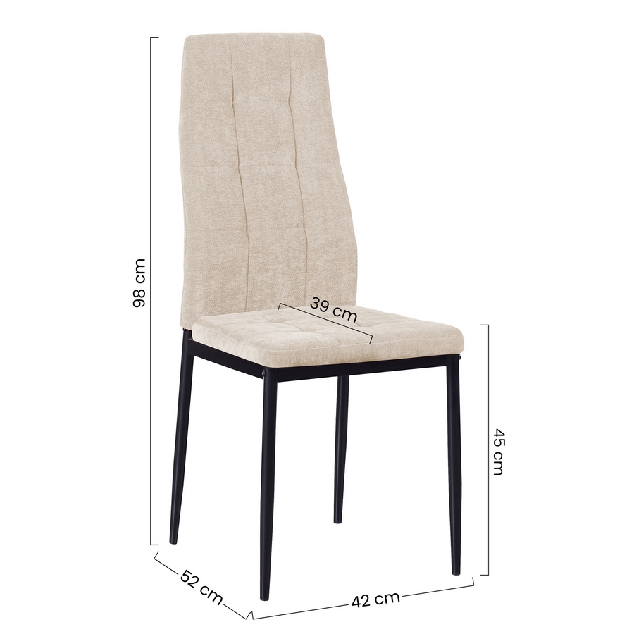 Set 4 sedie design in tessuto trapuntato. Dimensioni (LxPxA): 42x52x98 cm. Struttura in metallo verniciato a polvere nero Sp. 1,0 mm. Larghezza seduta: 42 cm. Profondita': 39 cm. H.seduta: 45 cm. Colore: beige.