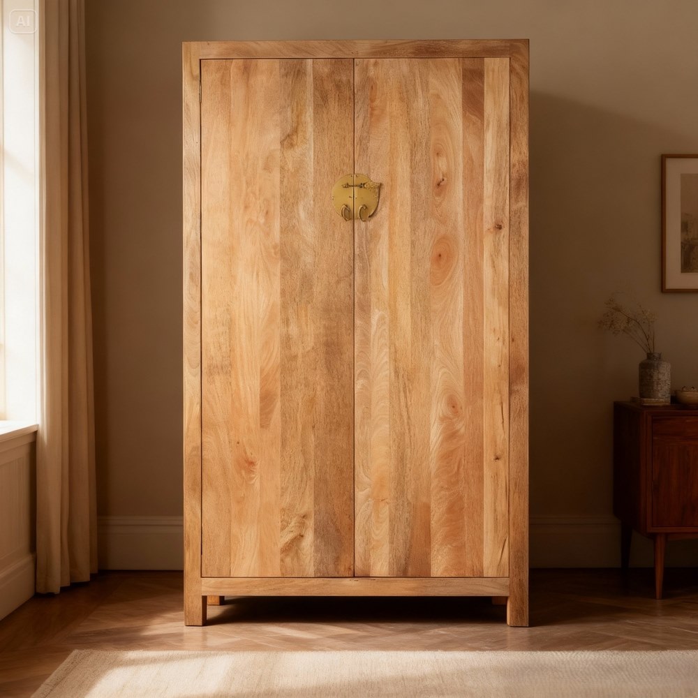 Armadio in legno di mango finitura natural. 2 ante, 4 ripiani e 2 cassetti interni. Dimensioni (LxPxA): 120x50x200 cm.
