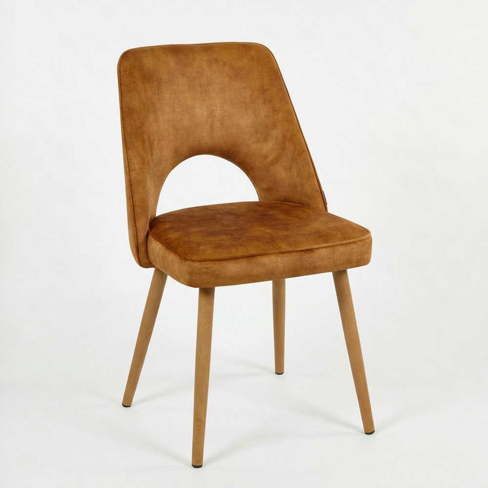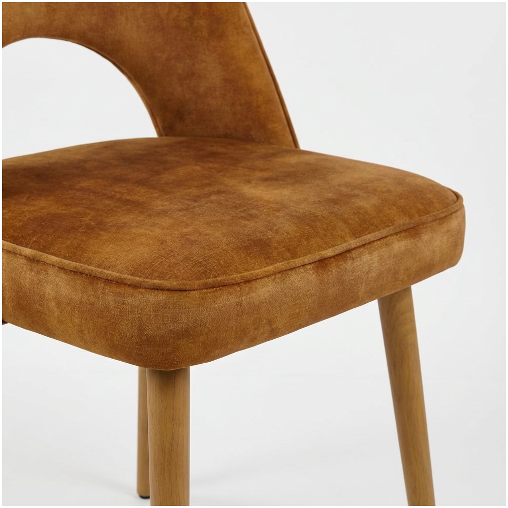 Set 4 sedie in tessuto effetto velluto, colore ocra. Dimensioni (LxPxA): 43x52x86 cm. Spessore seduta 9 cm, spessore schienale 4 cm.