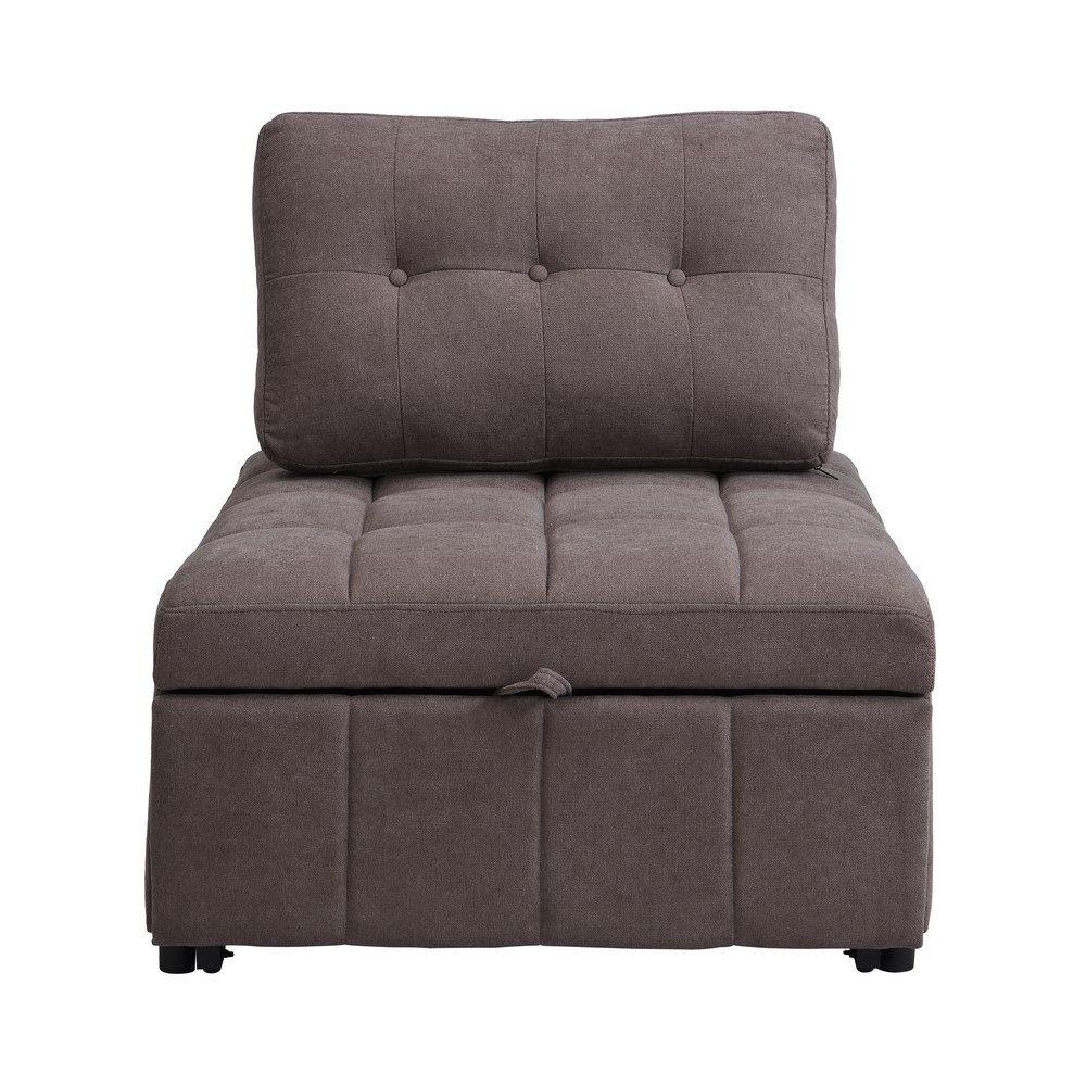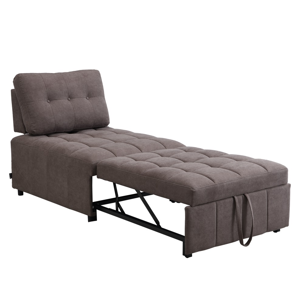 Poltrona letto in tessuto marrone. Dimensioni (LxPxA): 80x105-206x88 cm. Altezza seduta 45 cm. Imbottitura in schiuma ad alta densit, schienale reclinabile, gambe plastiche rotonde H 5 cm.