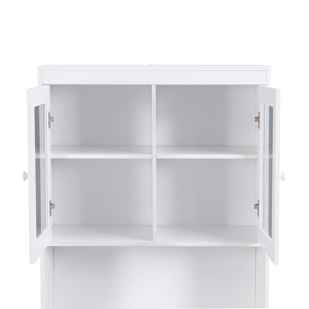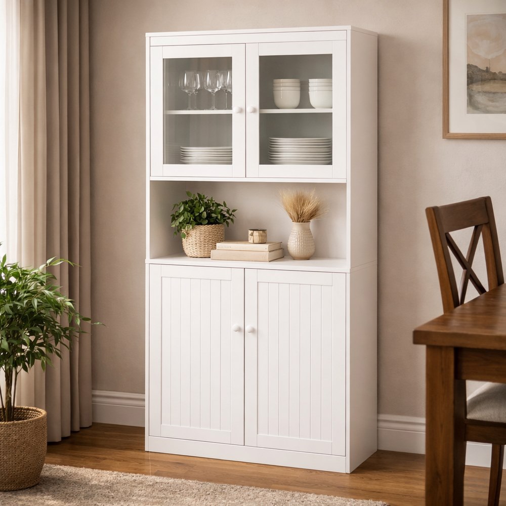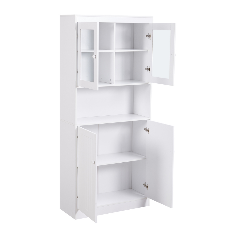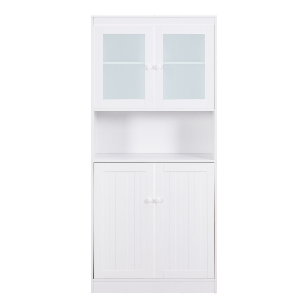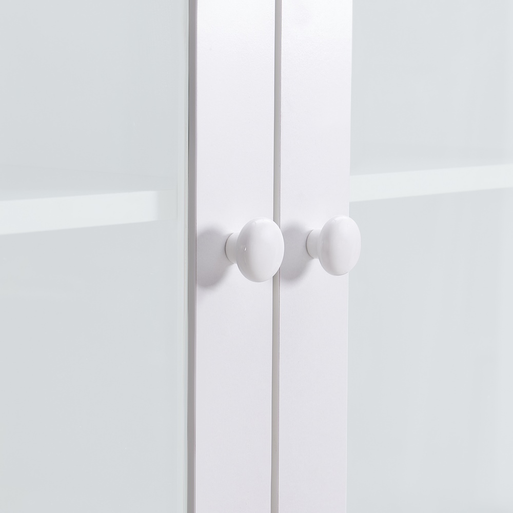 Credenza bianca 2 ante con vano interno, 1 vano a vista, 2 ante vetrate con vano interno. Dimensioni (LxPxA): 84x32x190 cm. Materiale legno melaminico Sp. 15mm, ante in MDF blister PVC, vetro Sp. 5mm manigle in alluminio