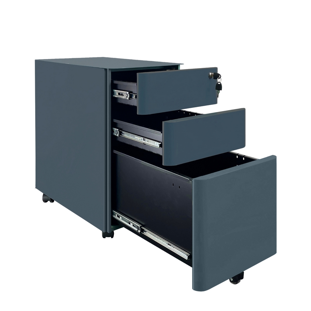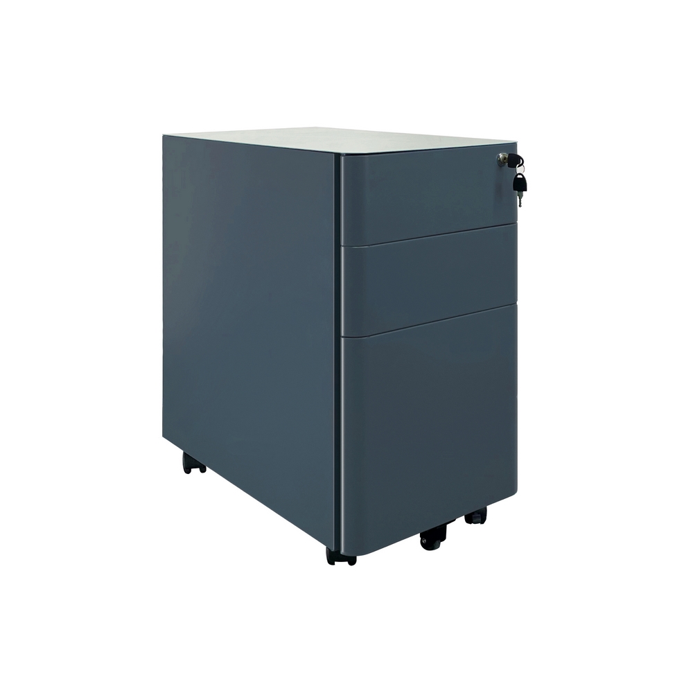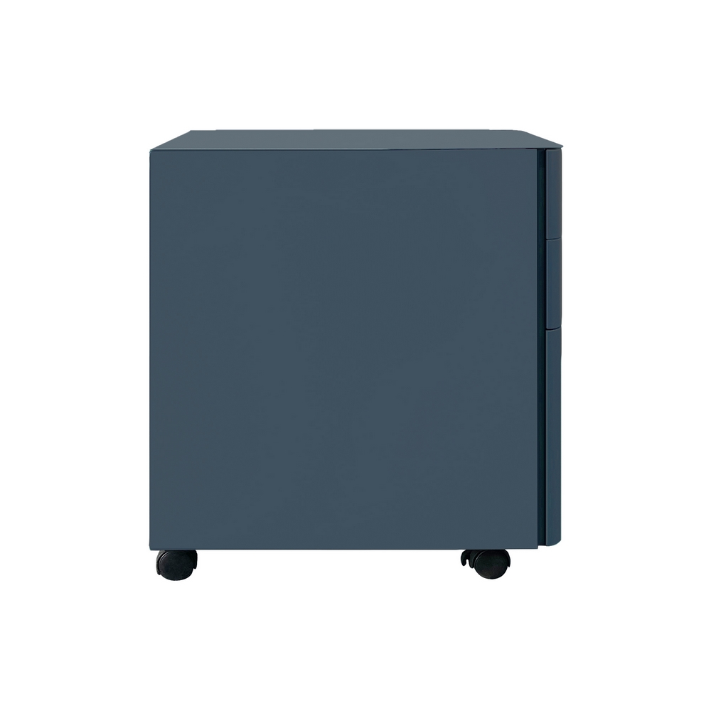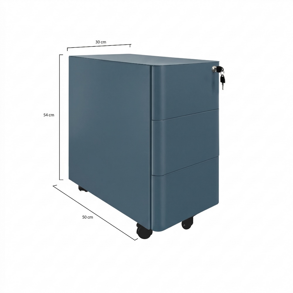 Cassettiera mobile in acciaio laminato a freddo di alta qualit. Dimensioni (LxPxA): 30x50x54 cm, spessore 0,6 mm. Colore ceruleo, verniciatura a polvere epossidica. Bordi curvi.