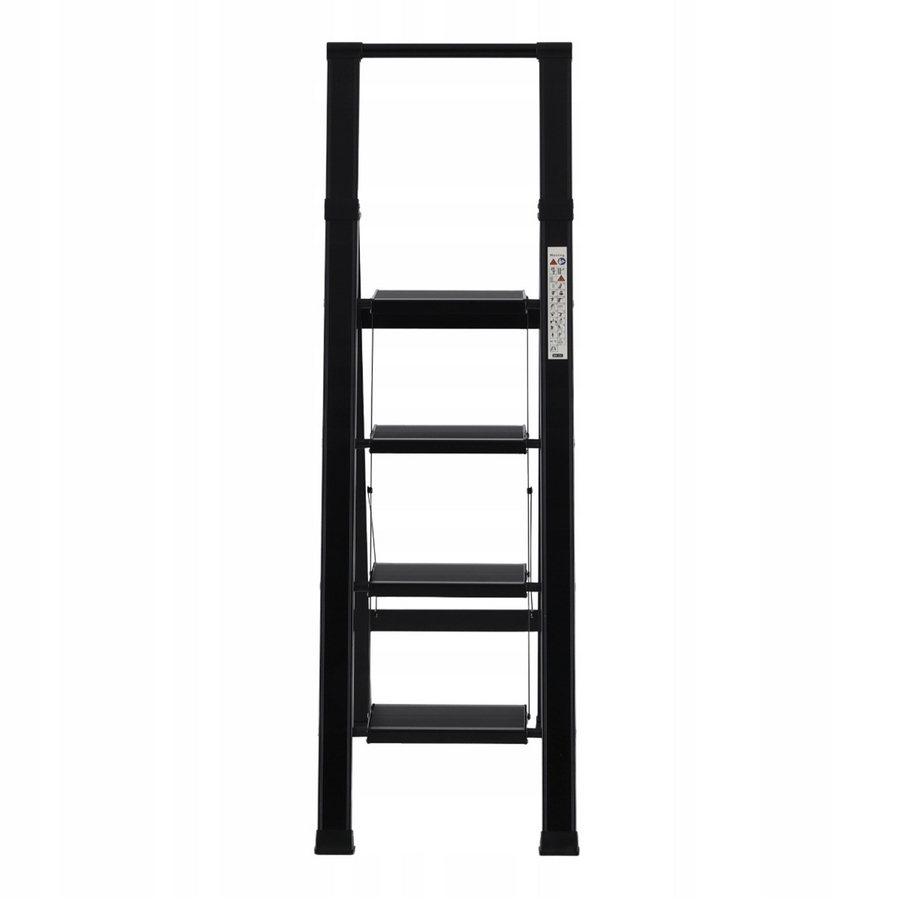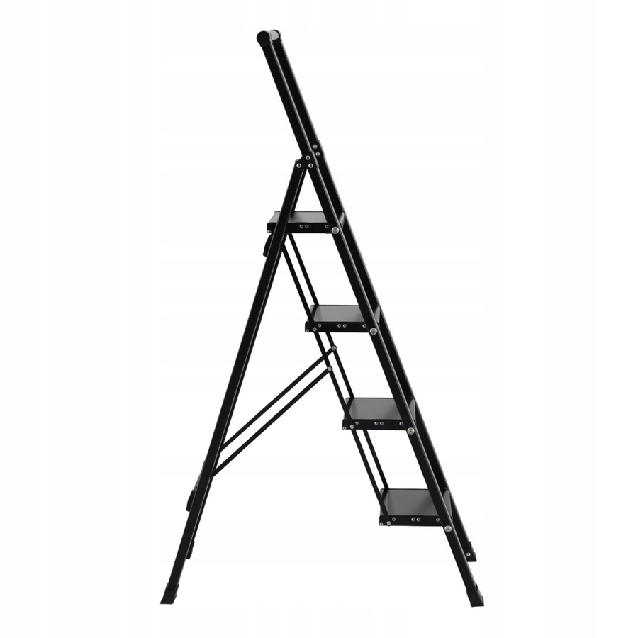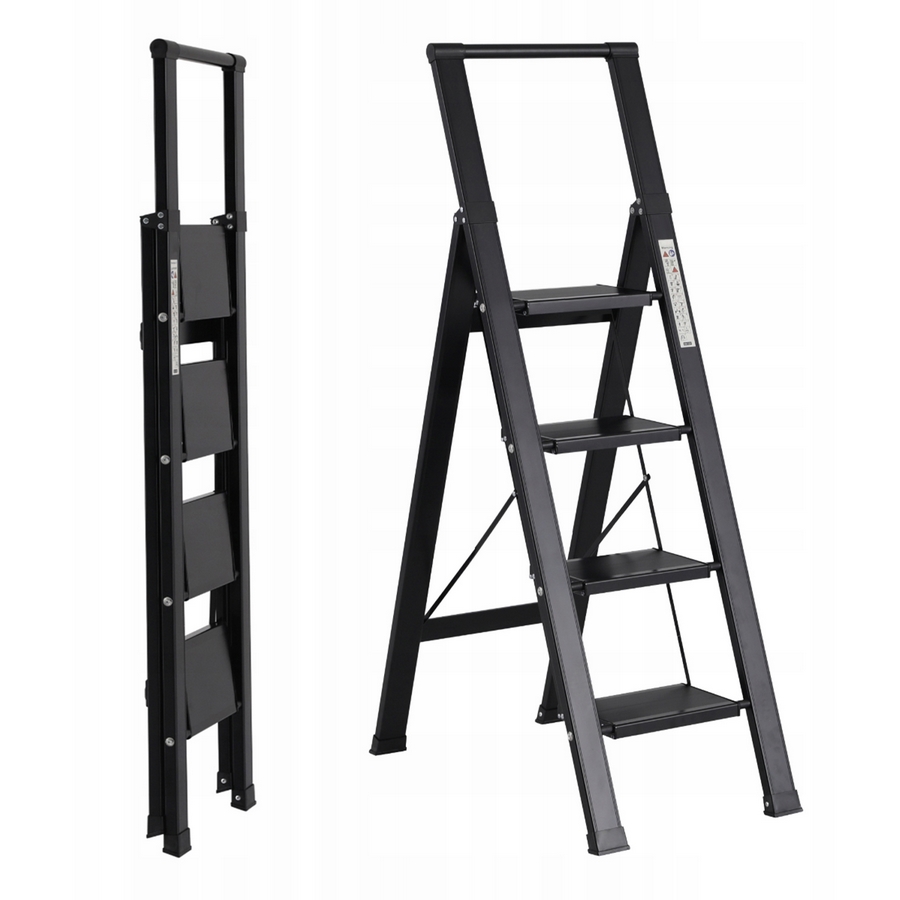Scala domestica nera in alluminio 4 gradini. Dimensioni scala aperta (LxPxA) 46,5x80x139,5 cm. Dimensioni gradino 28x18 cm. Distanza tra gradini 24,5 cm. Portata massima 150 kg.