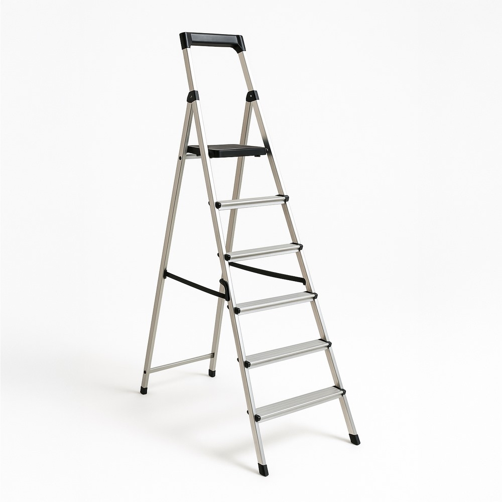 Scalain Alluminio 6 Gradini. Dimensione scala aperta: 198X68X117CM. Dimensione scala chiusa: 215X68X8,5CM. Distanza tra gradini: 23CM.