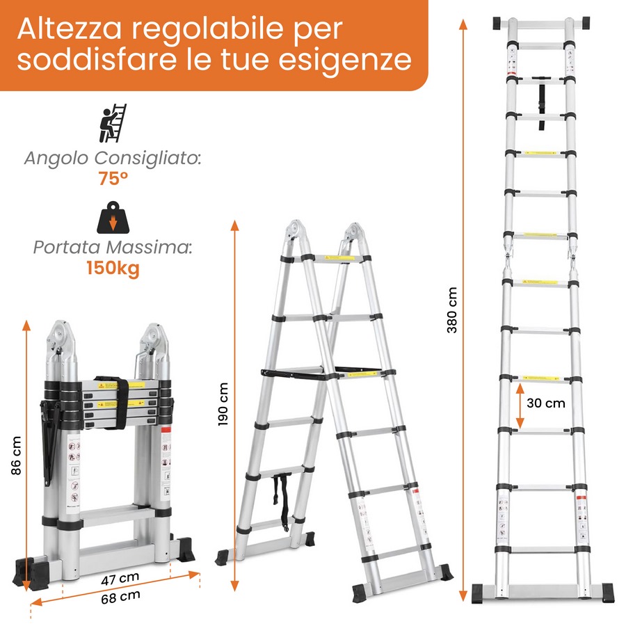 Dimensione scala pieghevole: 47x86x190cmDimensioni scala estesa: 47x86x380 cm.
