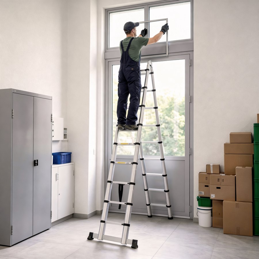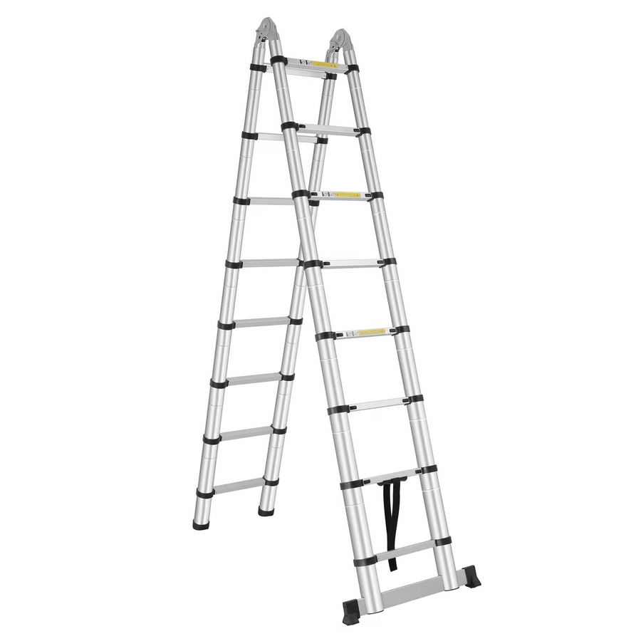 Scala telescopica in alluminio di 5m (2,5+2,5M). Spessore di 1,3-1,5 mm e carico massimo di 150 kg. Altezza gradini: 30 cm.