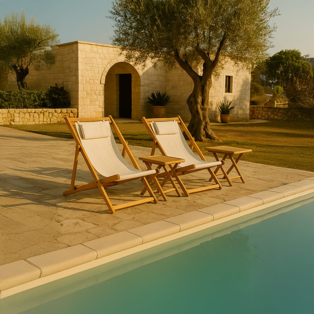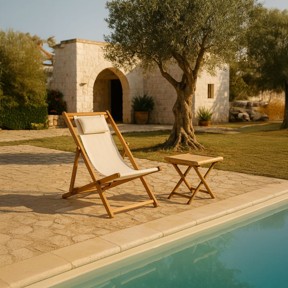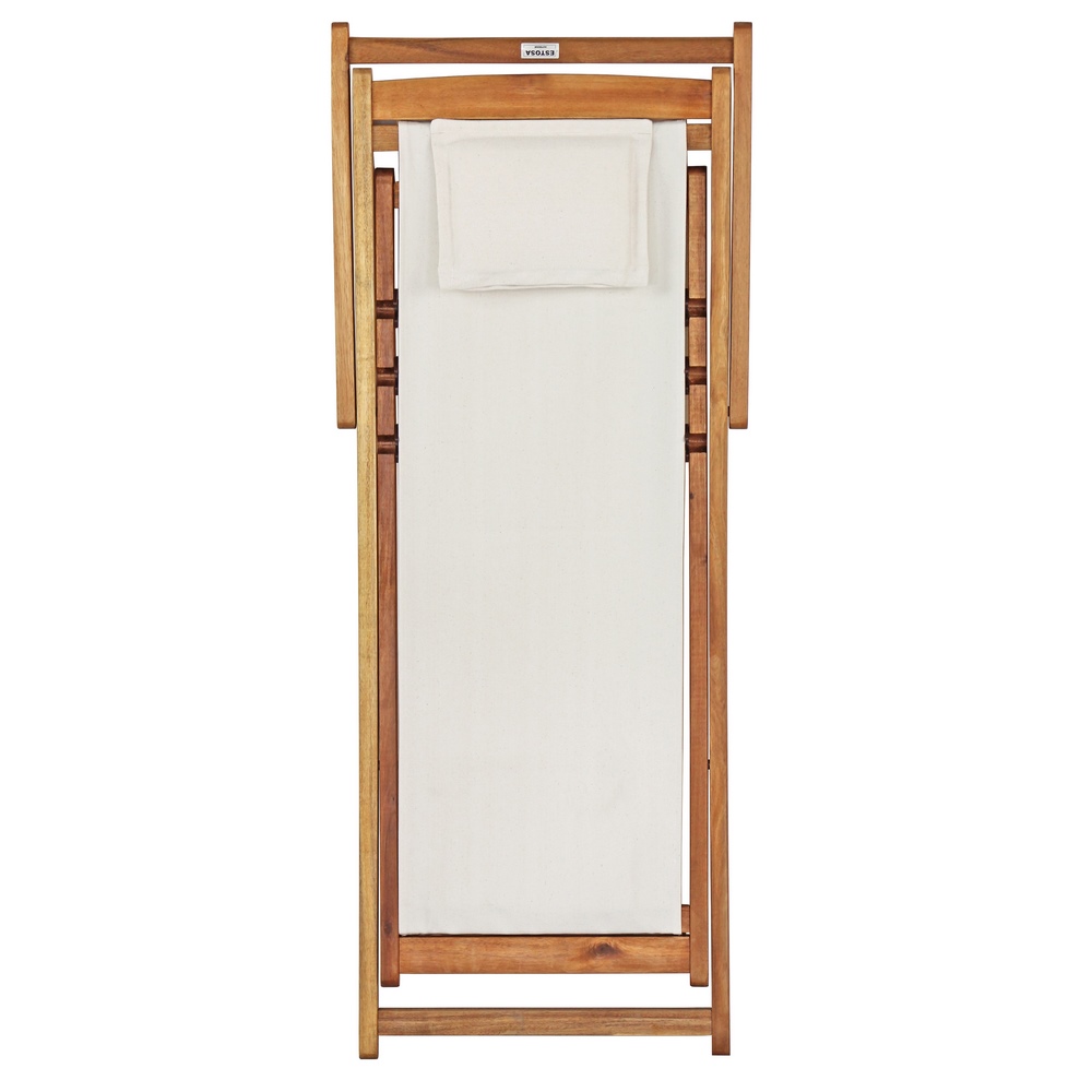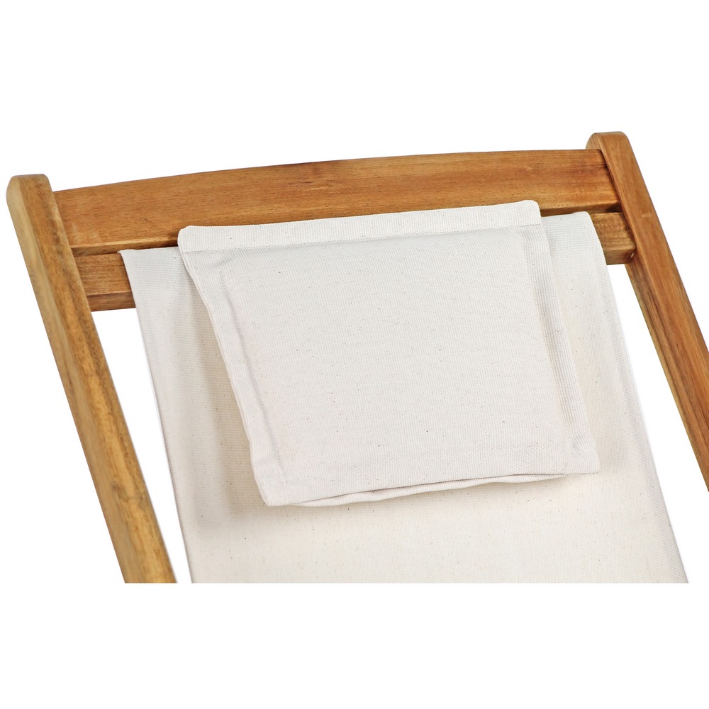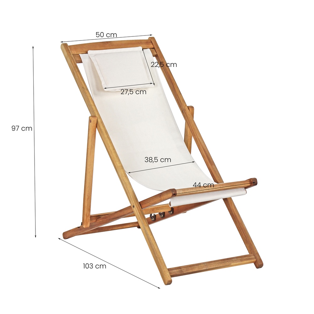 Sdraio da giardino richiudibile Erica - Dimensioni altezza max: 103x50x97h cm - Dimensioni da chiusa: 55x5x139h cm - Materiale: legno di acacia oliata - 3 possibili inclinazioni - Con cuscino 27,5x22,5 cm - Ecrù. Portata massima 90kg