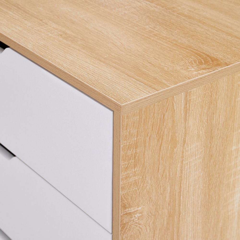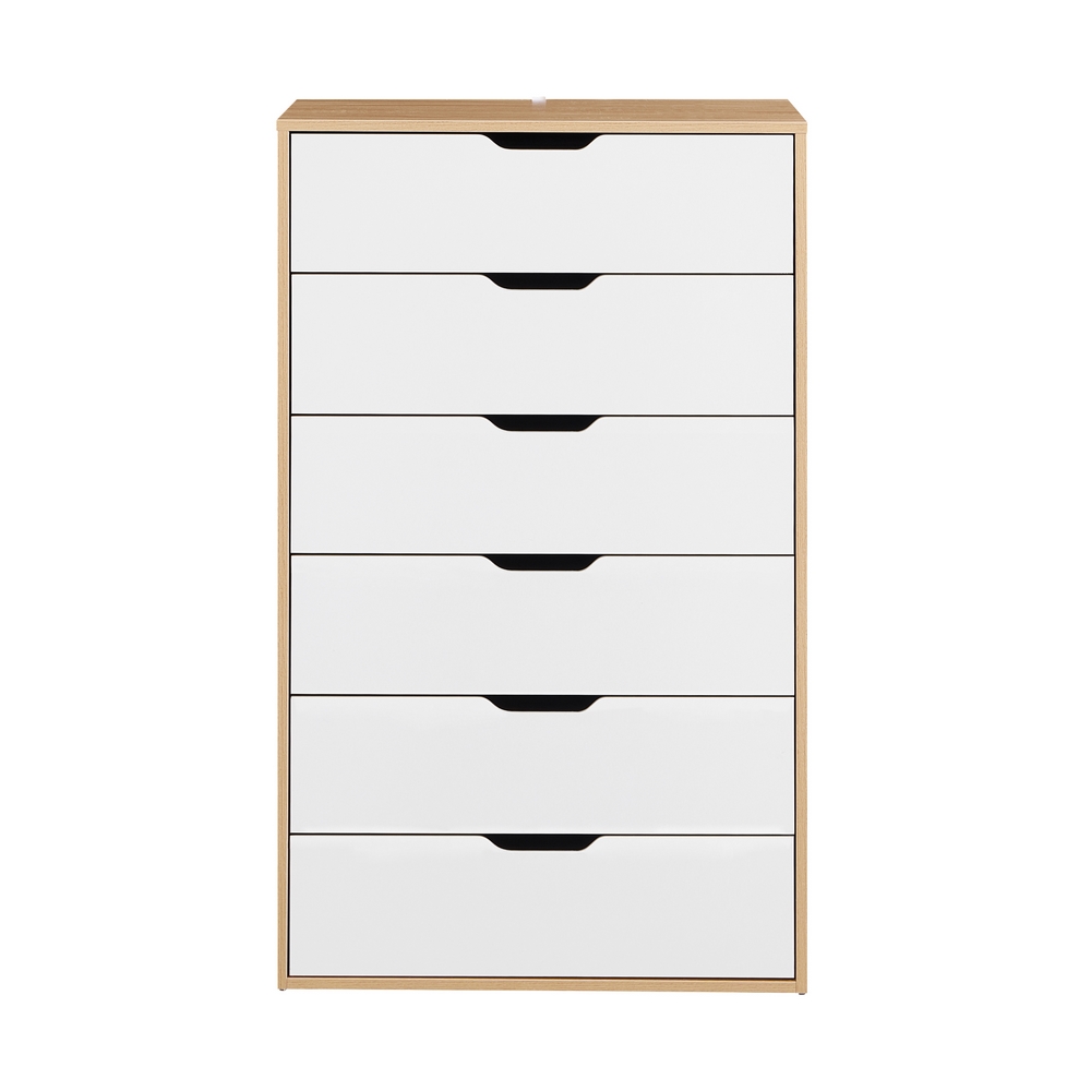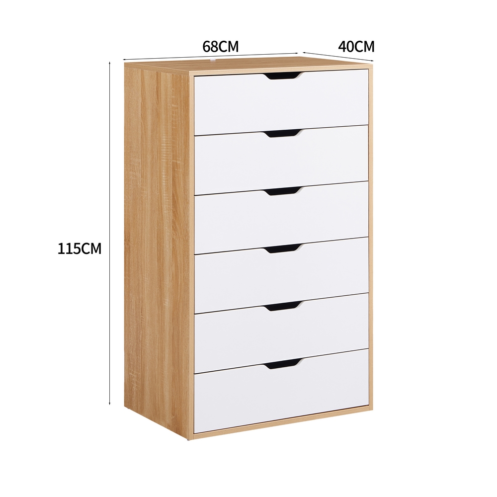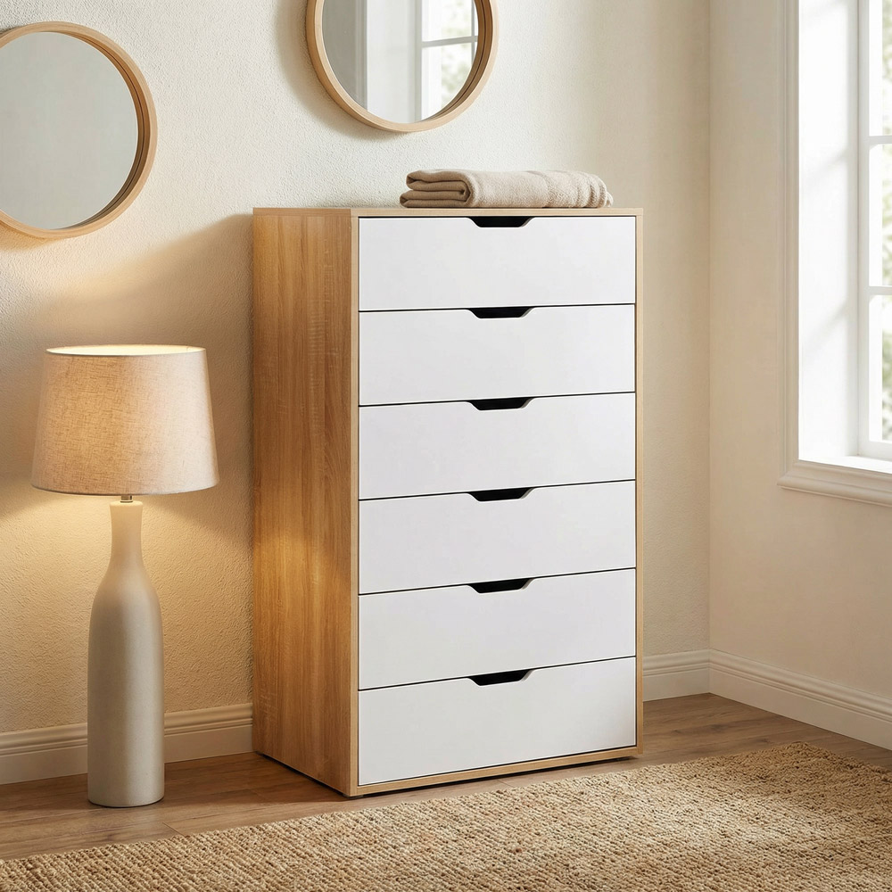 Cassettiera con 6 cassetti bianca e rovere. Dimensioni (LxPxA): 68x40x115 cm. Materiale: pannello truciolare da 15 mm, carta melaminica a doppia faccia, striscia di tenuta laterale dello stesso colore 0,8 mm