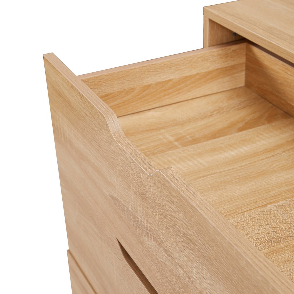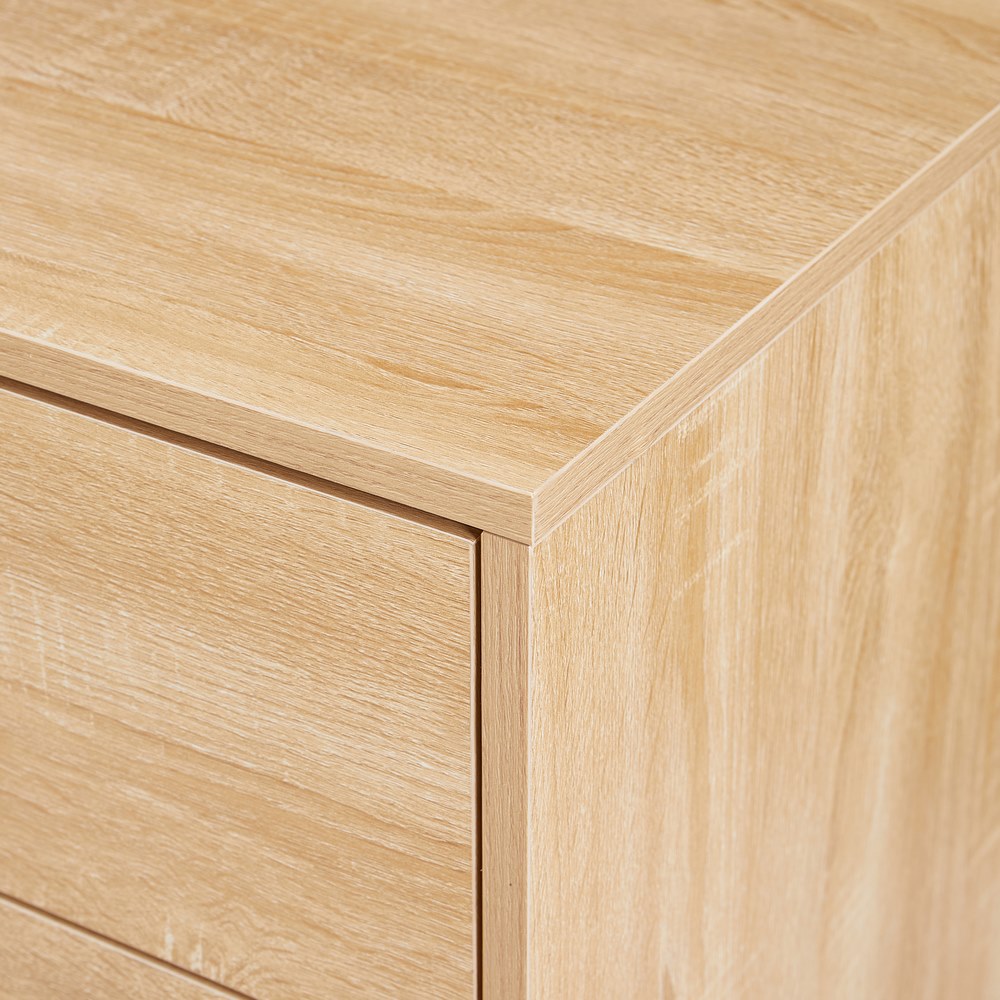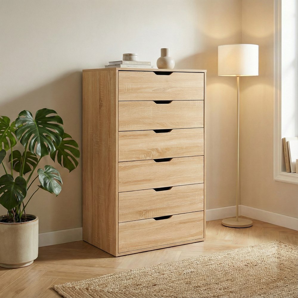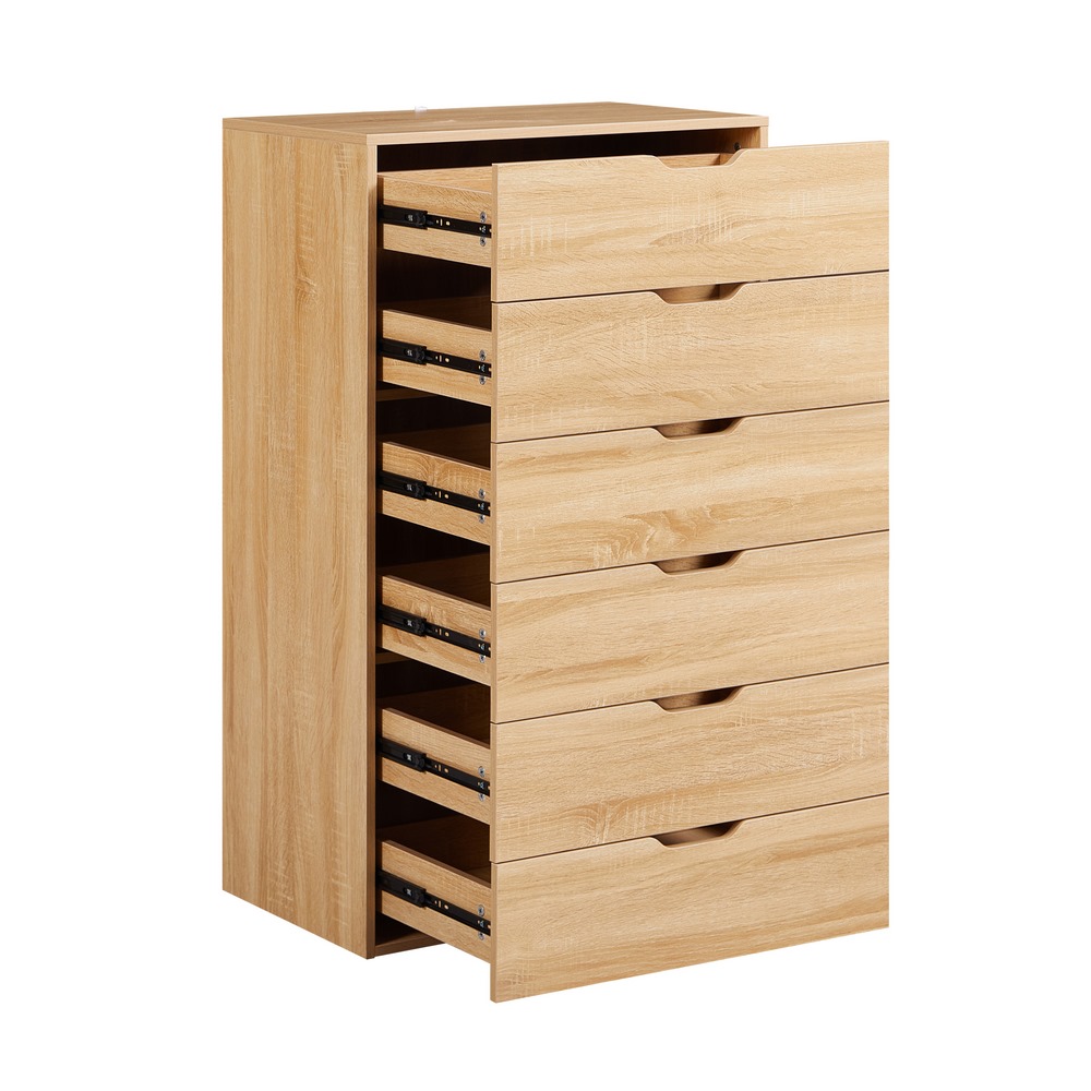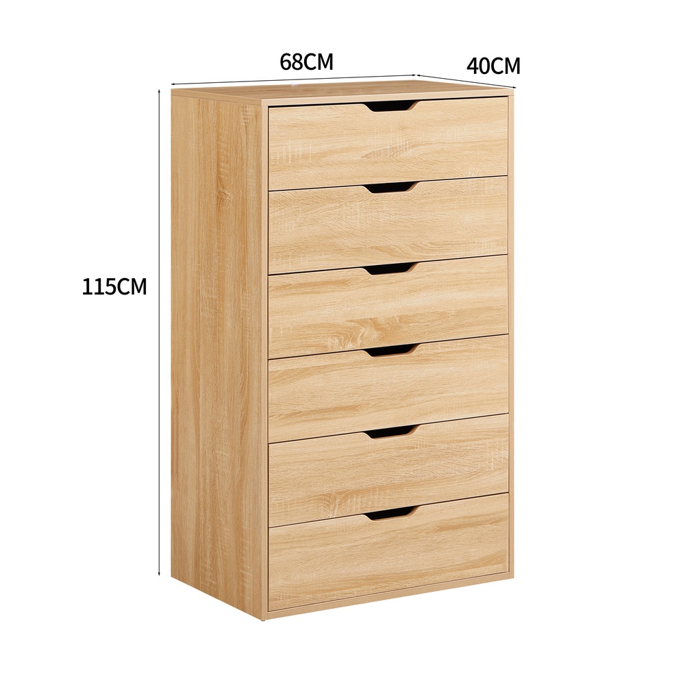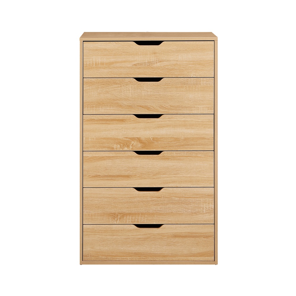 Cassettiera con 6 cassetti color rovere. Dimensioni (LxPxA): 68x40x115 cm. Materiale: pannello truciolare da 15 mm, carta melaminica a doppia faccia, striscia di tenuta laterale dello stesso colore 0,8 mm