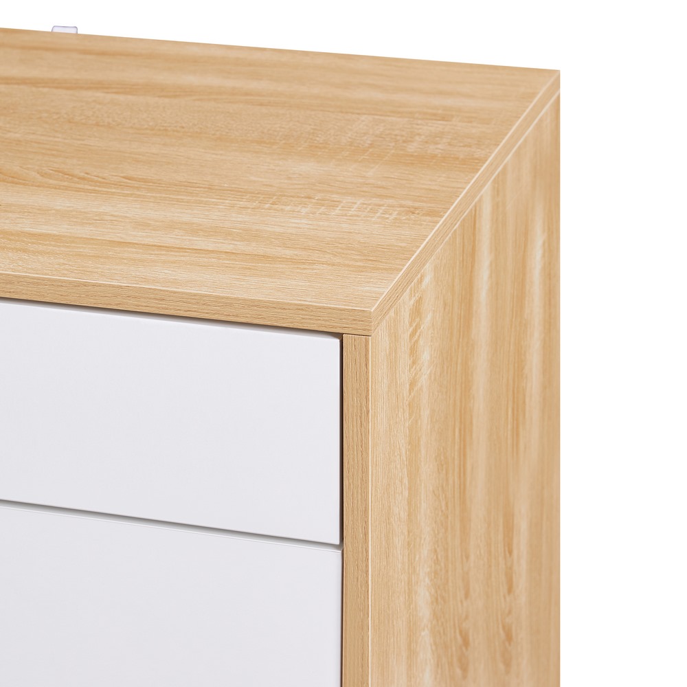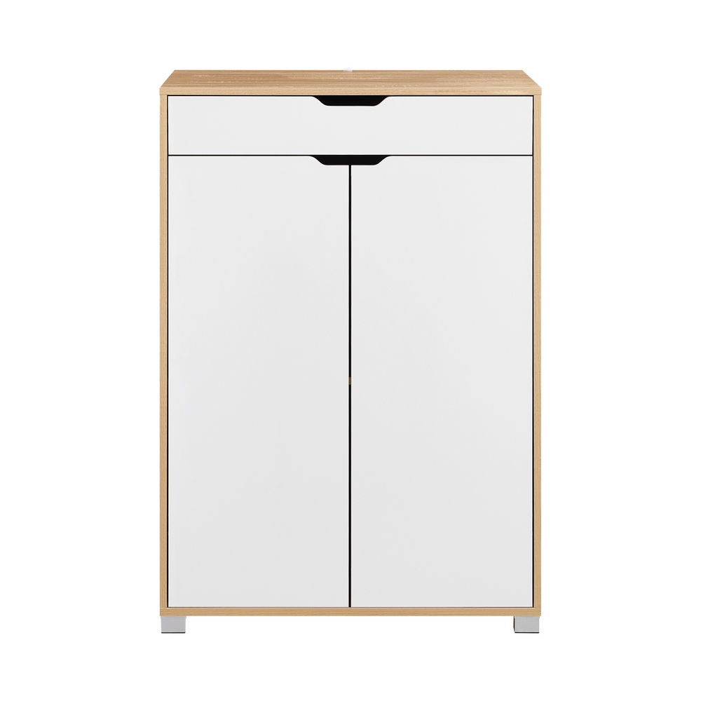 Mobiletto bianco e rovere naturale con 2 ante ed 1 cassetto. Dimensioni (LxPxA): 76,8x50x113cm. Piedi in plastica.