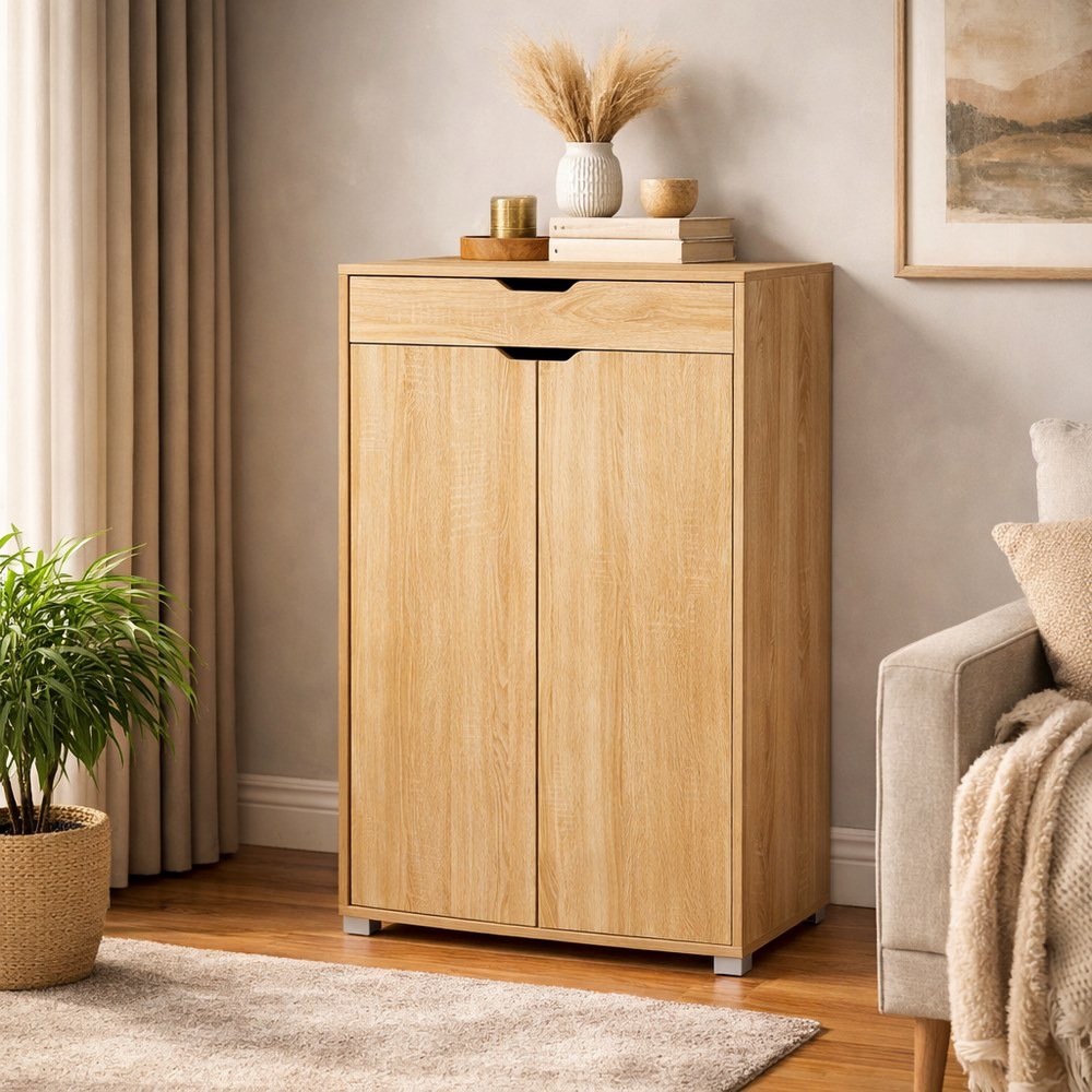 Mobiletto rovere naturale con 2 ante ed 1 cassetto. Dimensioni (LxPxA): 76,8x50x113cm. Piedi in plastica.