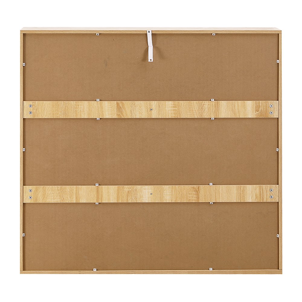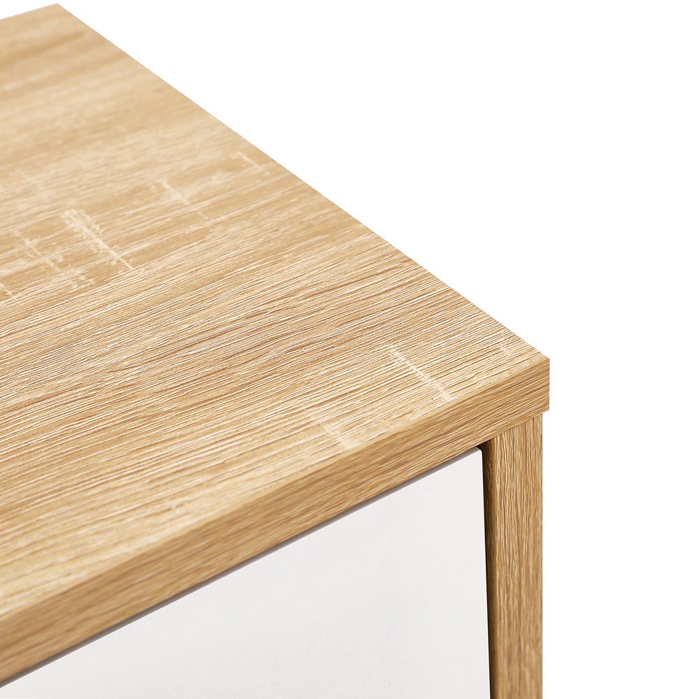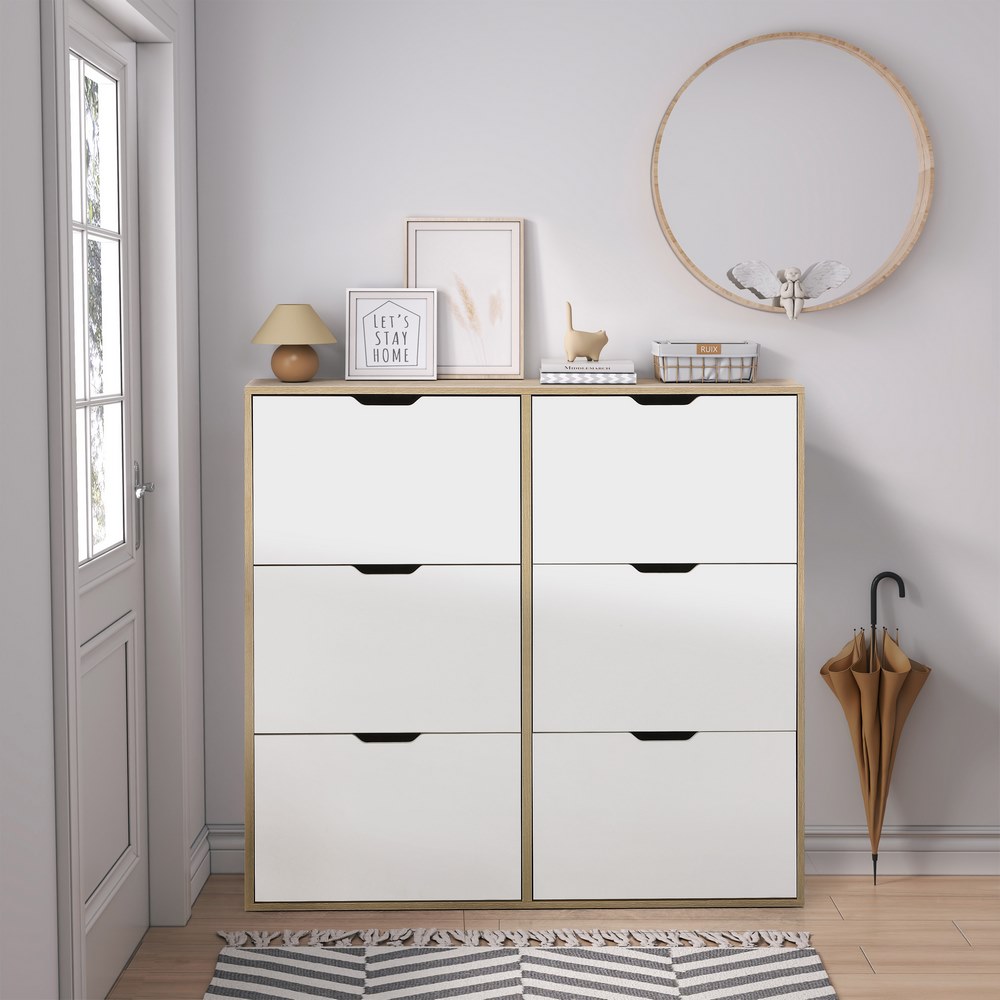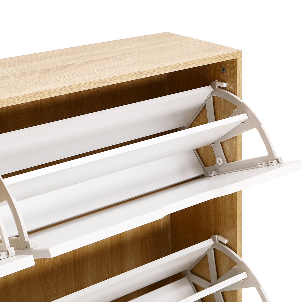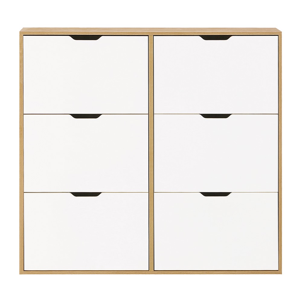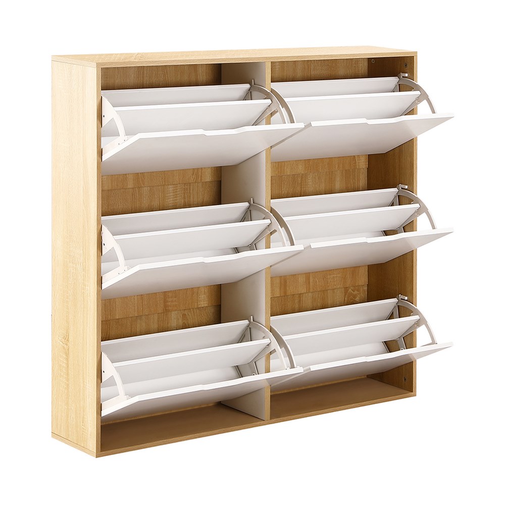 Scarpiera doppia 6 vani bianca e rovere. Dimensioni (LxPxA): 120x24x114 cm. Materiale: pannello truciolare da 15 mm con carta melaminica bifacciale, striscia di tenuta laterale da 0,8mm, piastra posteriore Sp. 3mm.