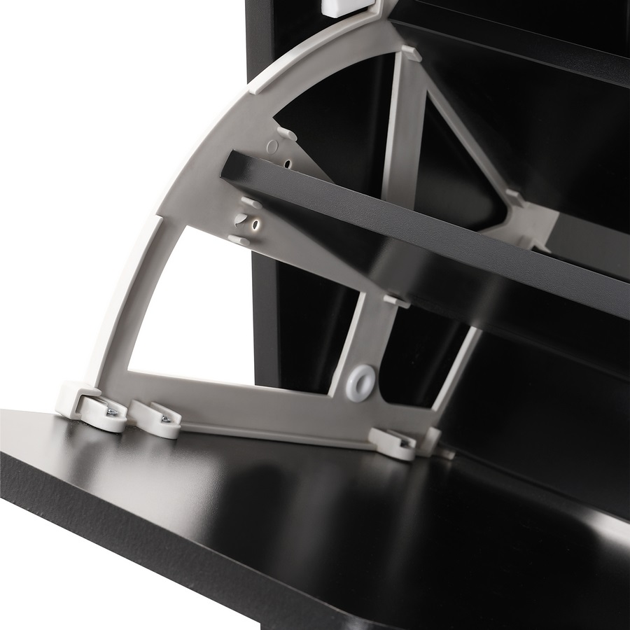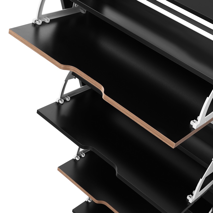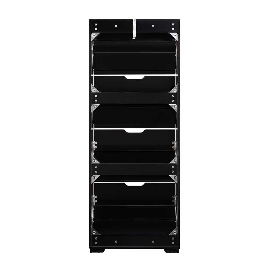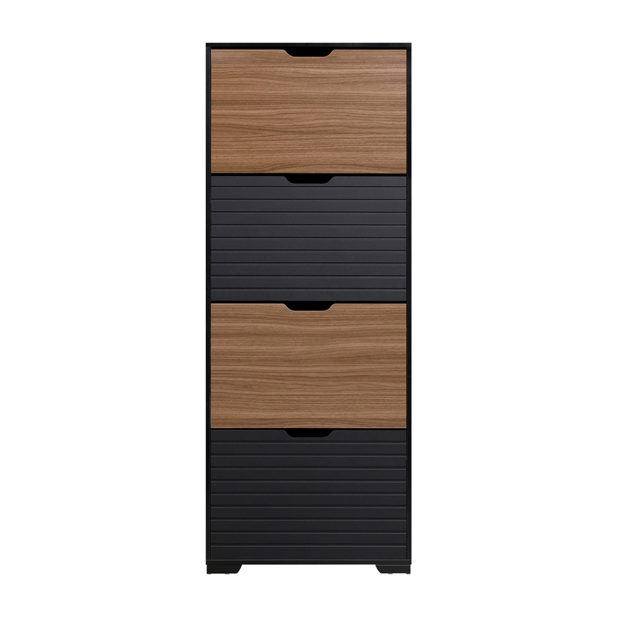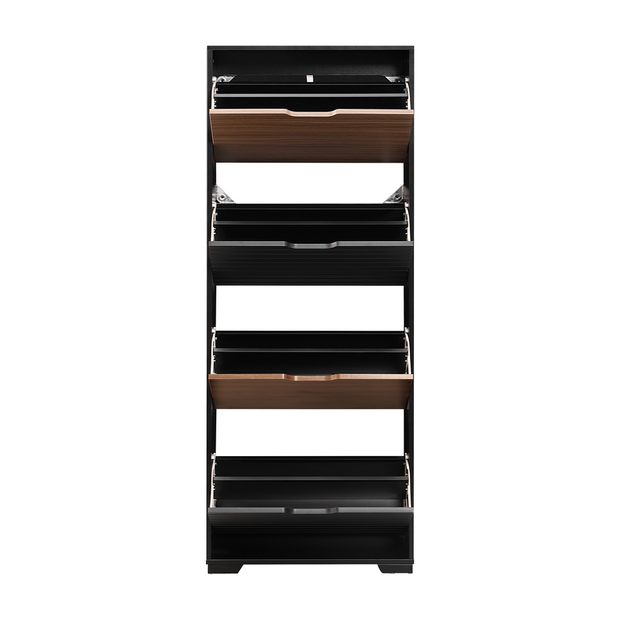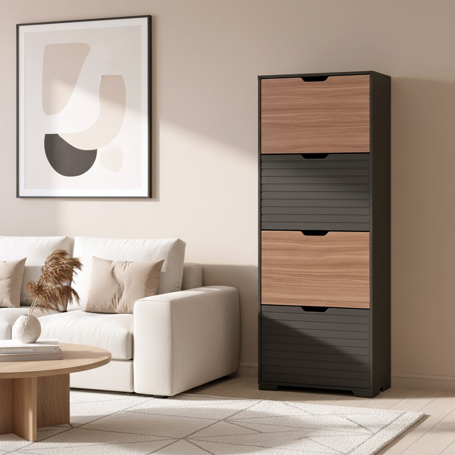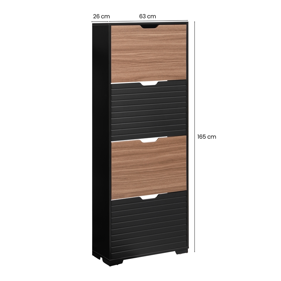 Scarpiera 4 ante a ribalta con divisorio interno in plastica, colore noce e nero. Dimensioni (LxPxA): 63x26x165 cm. Materiale legno melaminico Sp.15 mm. Ante nere lavorazione blister cannettata. Gambe metalliche.