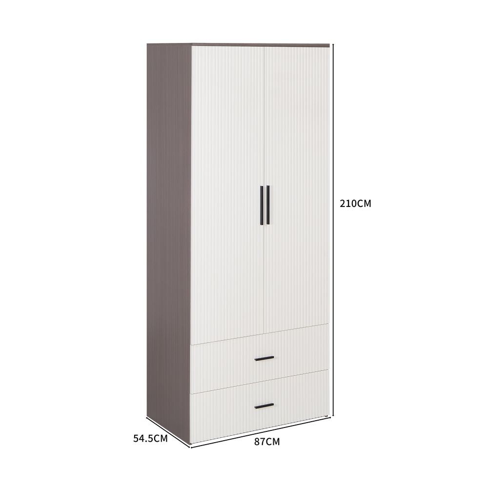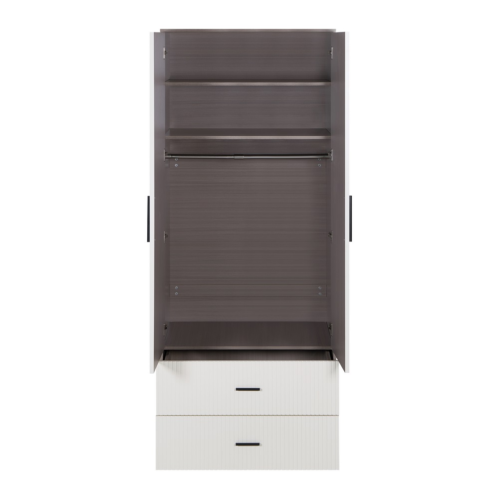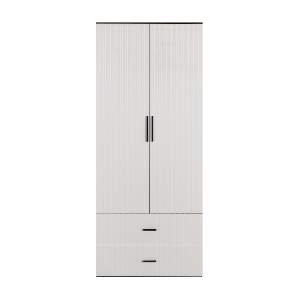 Armadio avorio con appendiabiti, 2 ante, 2 cassetti e 2 mensole. Dimensioni (LxPxA): 87x54x210 cm. Materiale legno truciolare spessore 15 mm. Anta in MDF blister PVC spessore 18 mm, lavorazione cannettata.