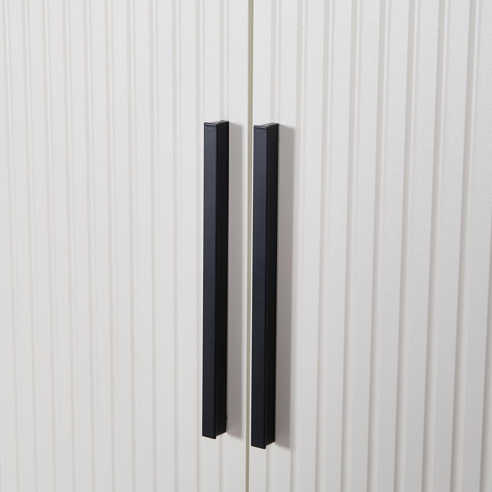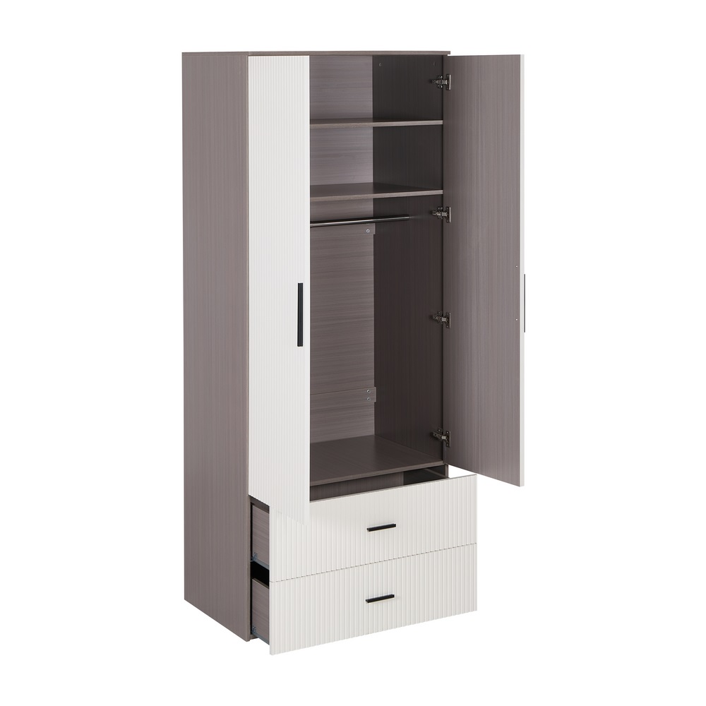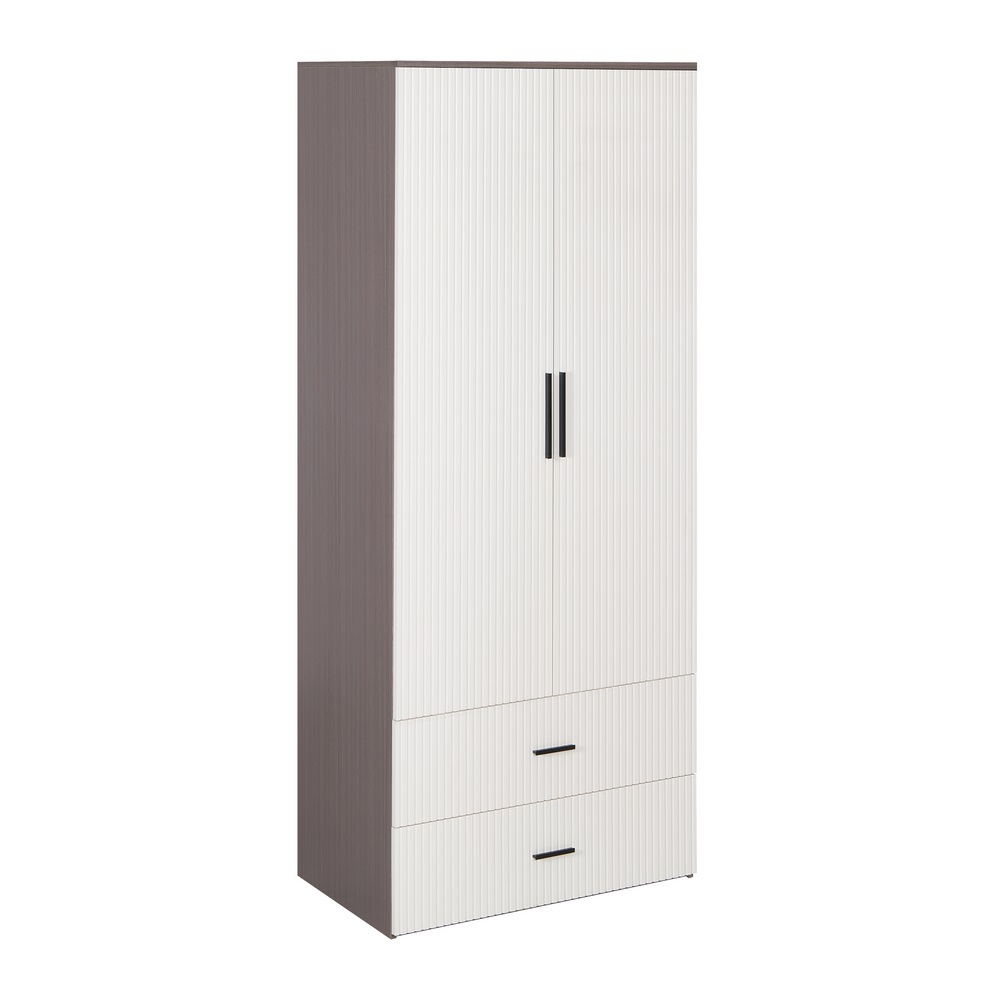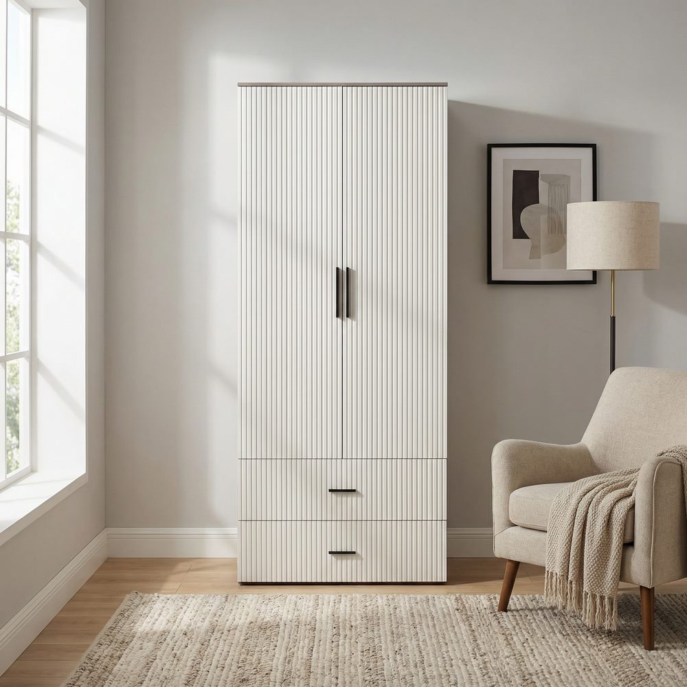 Armadio avorio con appendiabiti, 2 ante, 2 cassetti e 2 mensole. Dimensioni (LxPxA): 87x54x210 cm. Materiale legno truciolare spessore 15 mm. Anta in MDF blister PVC spessore 18 mm, lavorazione cannettata.