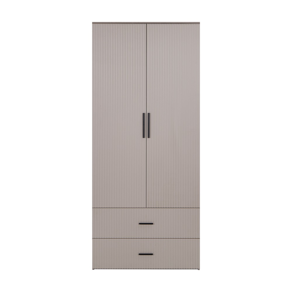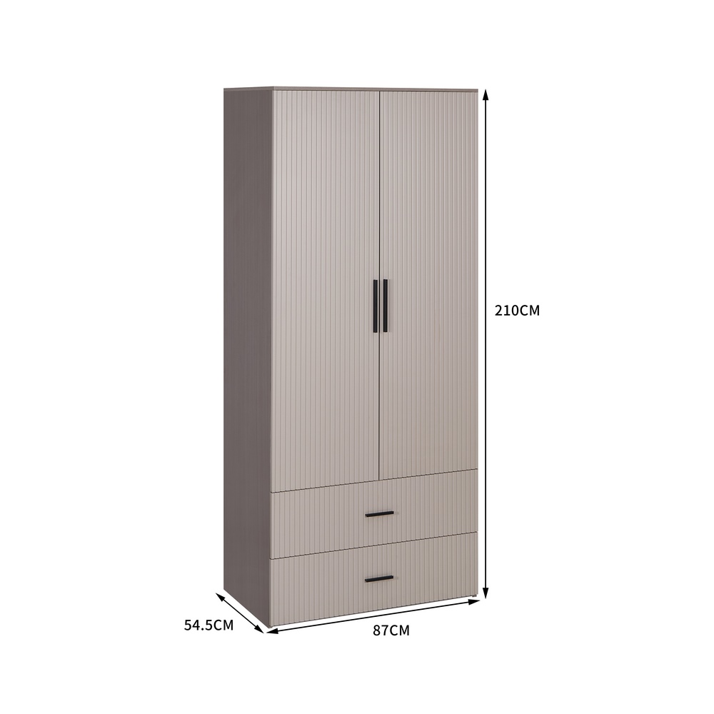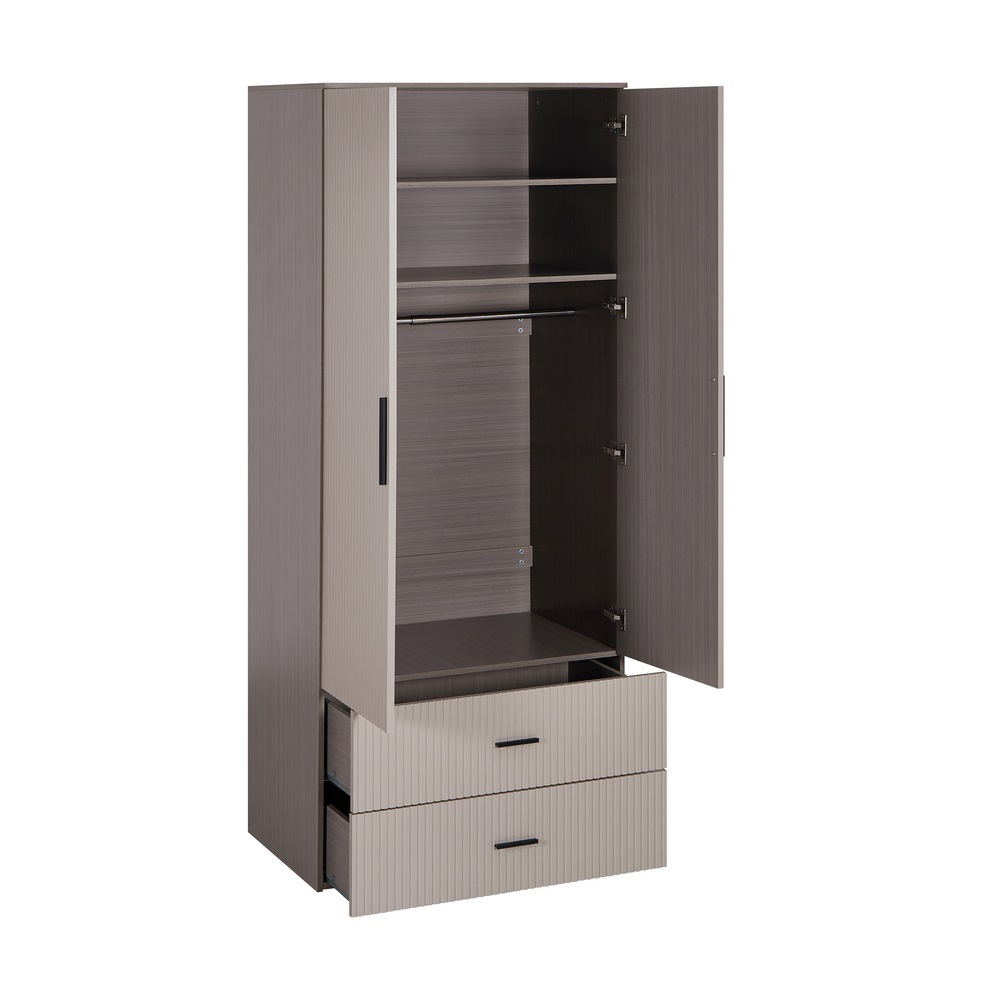 Armadio tortora con appendiabiti, 2 ante, 2 cassetti e 2 mensole. Dimensioni (LxPxA): 87x54x210 cm. Materiale legno truciolare spessore 15 mm. Anta in MDF blister PVC spessore 18 mm, lavorazione cannettata.