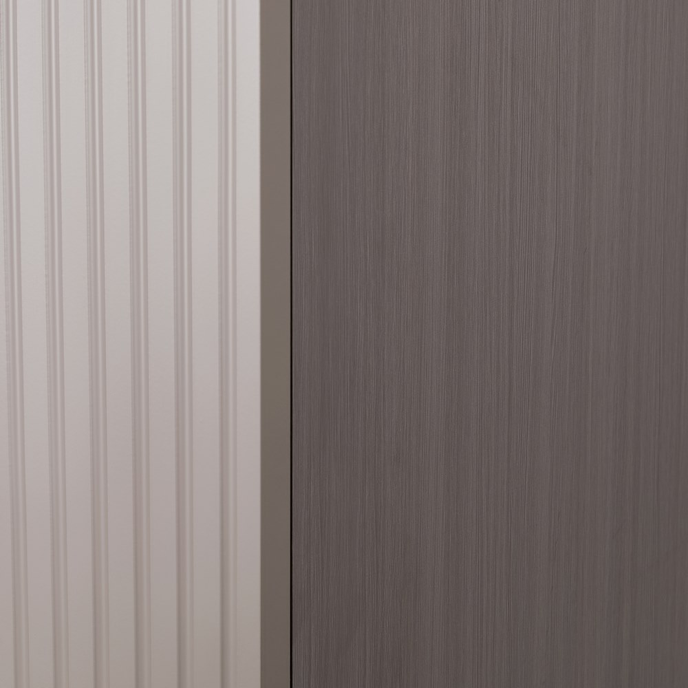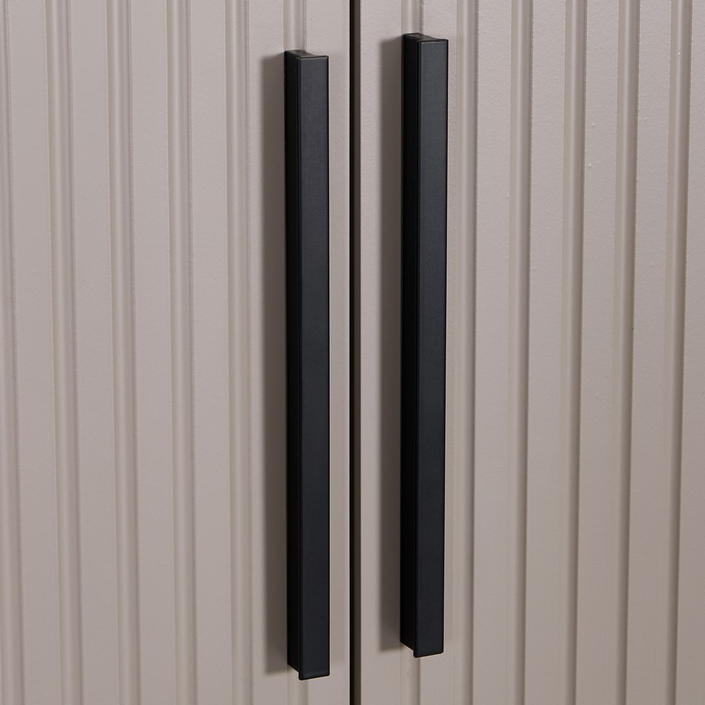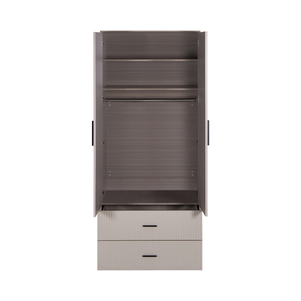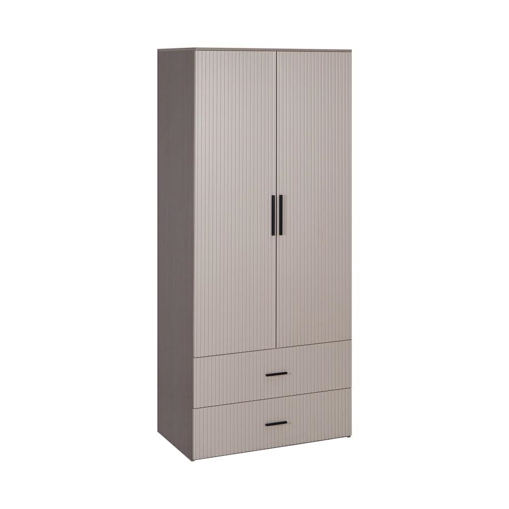 Armadio tortora con appendiabiti, 2 ante, 2 cassetti e 2 mensole. Dimensioni (LxPxA): 87x54x210 cm. Materiale legno truciolare spessore 15 mm. Anta in MDF blister PVC spessore 18 mm, lavorazione cannettata.