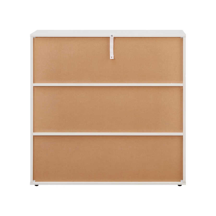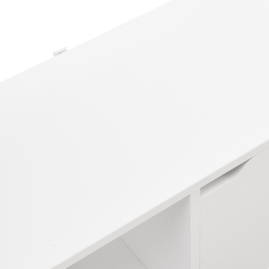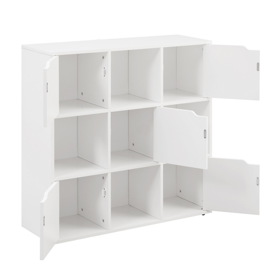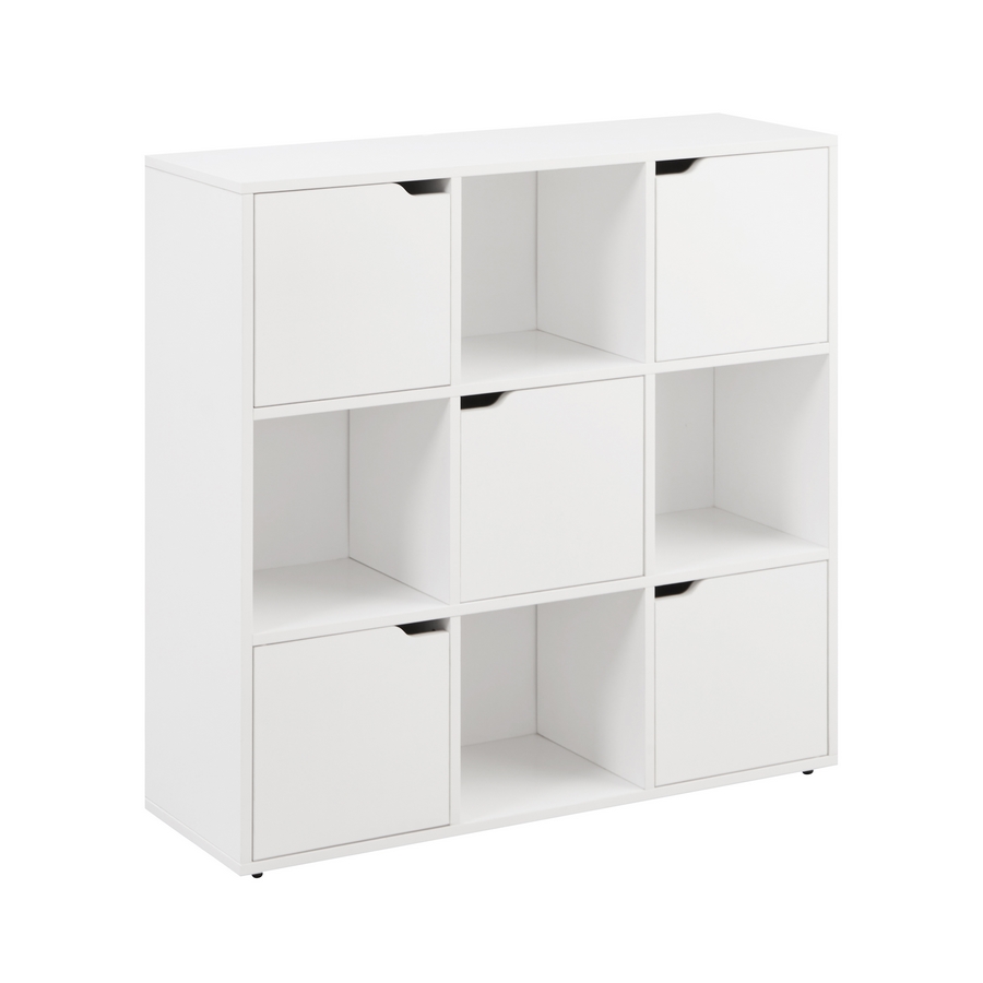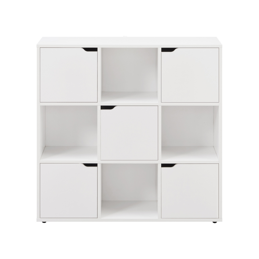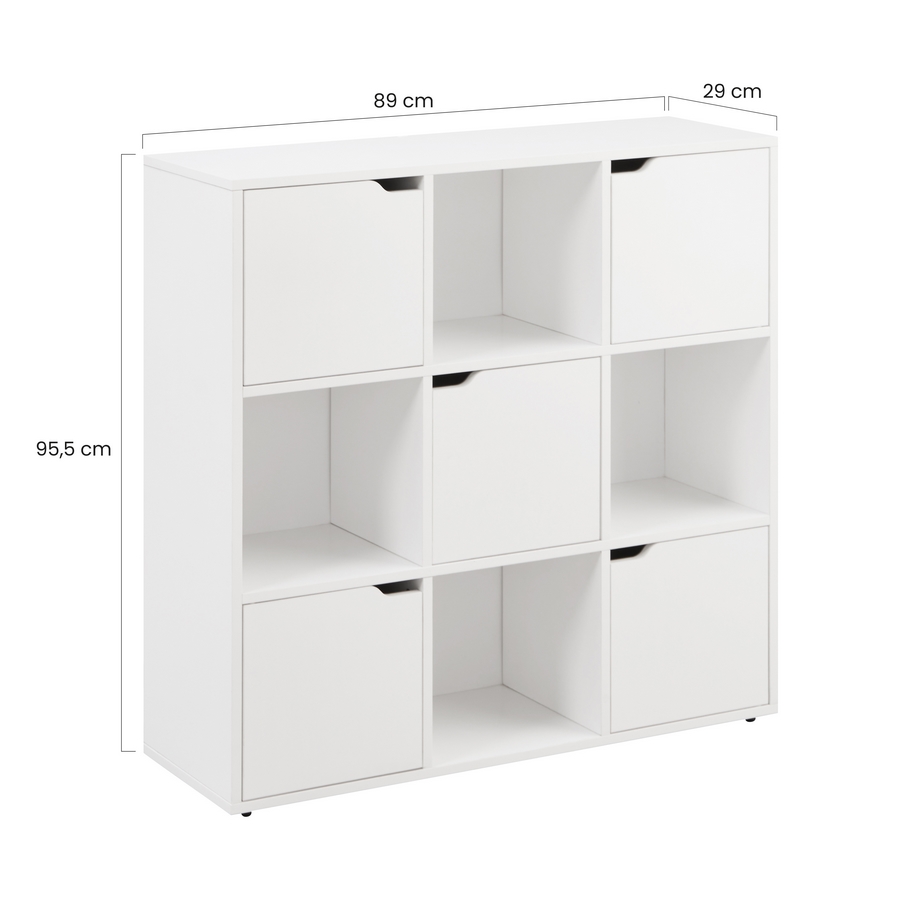 Mobile mensola libreria 9 cubi e 5 ante, colore bianco. Dimensioni (LxPxA): 88,8x29x90,5 cm. Materiale legno truciolare Sp. 15 mm, ante in MDF Sp. 15 mm, piedi in plastica nera.