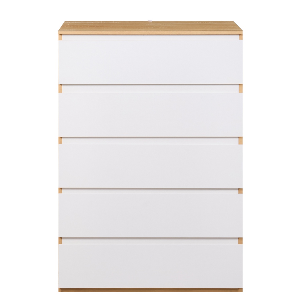 Cassettiera 5 cassetti bianca e rovere naturale. Dimensioni (LxPxA): 76,8x50x113 cm. Struttura in legno melaminico Sp. 15 mm. Con pannello posteriore. Prodotto da assemblare.
