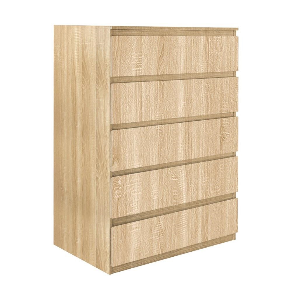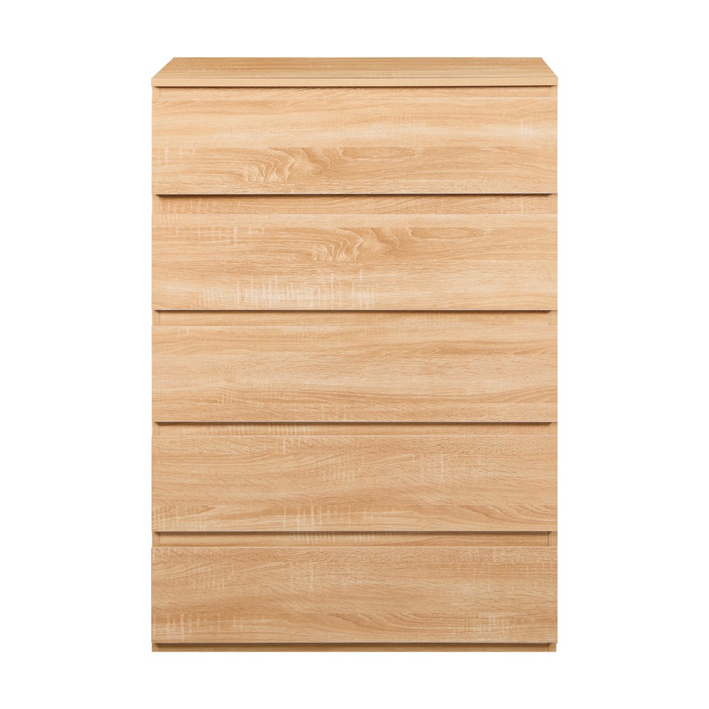 Cassettiera 5 cassetti color rovere naturale. Dimensioni (LxPxA): 76,8x50x113 cm. Struttura in legno melaminico Sp. 15 mm. Con pannello posteriore. Prodotto da assemblare.