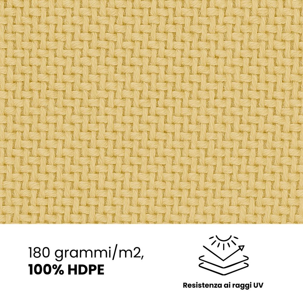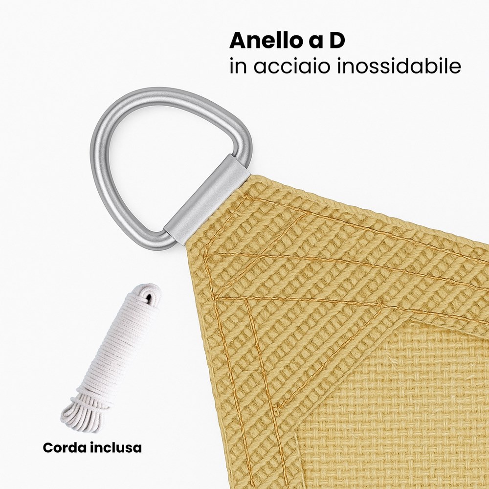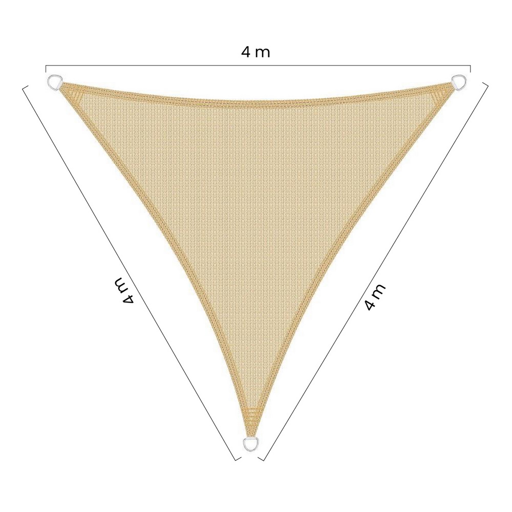 Vela parasole triangolare 4x4x4m beige.180 grammi/m2, 100% HDPE con resistenza ai raggi UV, Anello a D in acciaio inossidabile su ogni lato, per legare la corda. Borsa per il trasporto con cerniera in PVC.