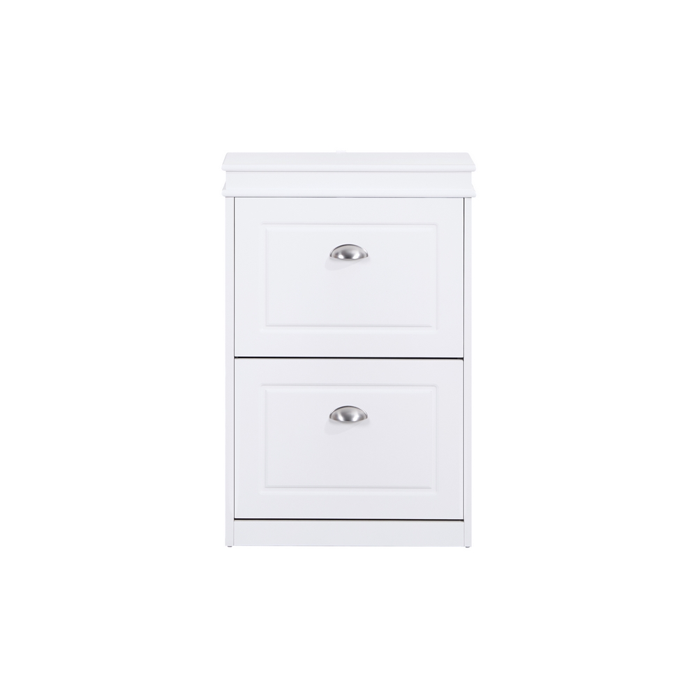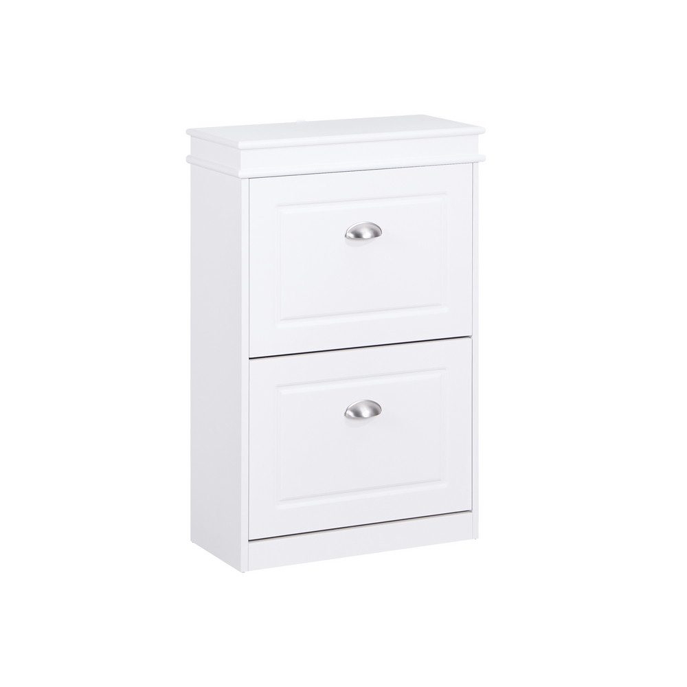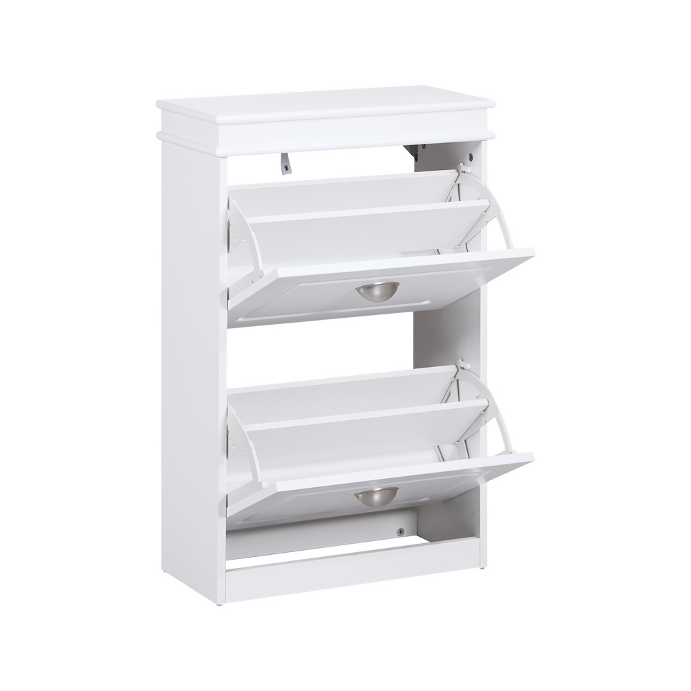 Scarpiera bianca bugnata con 2 ribalte disposte verticalmente. Dimensioni (LxPxA): 53x24x82 cm. Materiale legno MDF lavorazione blister PVC. Maniglie in alluminio.