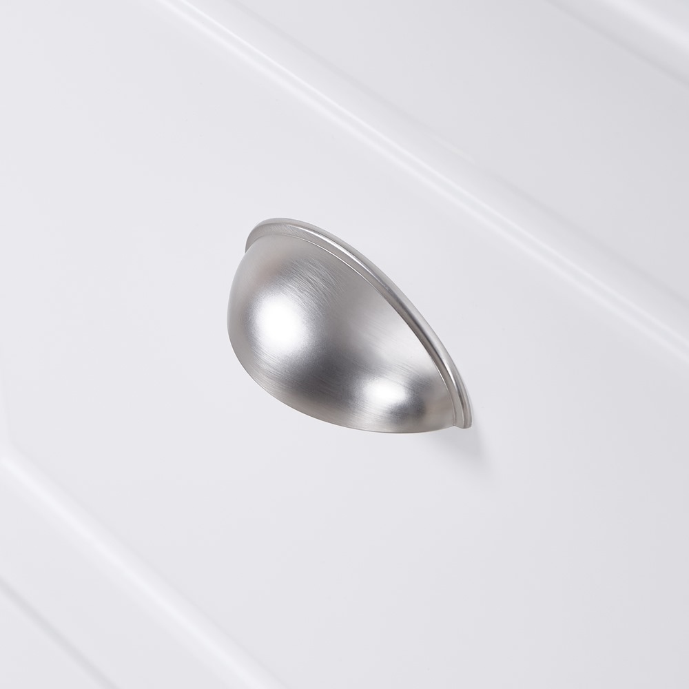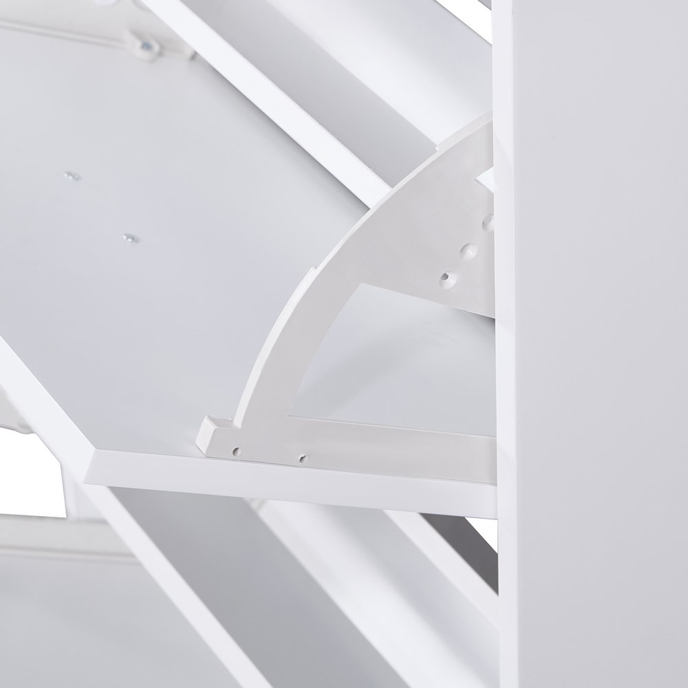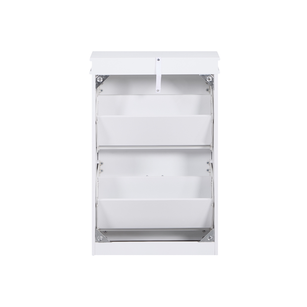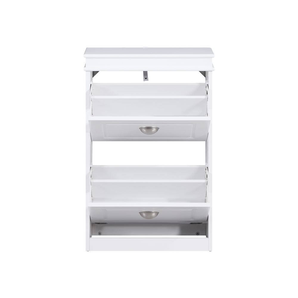 Scarpiera bianca bugnata con 2 ribalte disposte verticalmente. Dimensioni (LxPxA): 53x24x82 cm. Materiale legno MDF lavorazione blister PVC. Maniglie in alluminio.