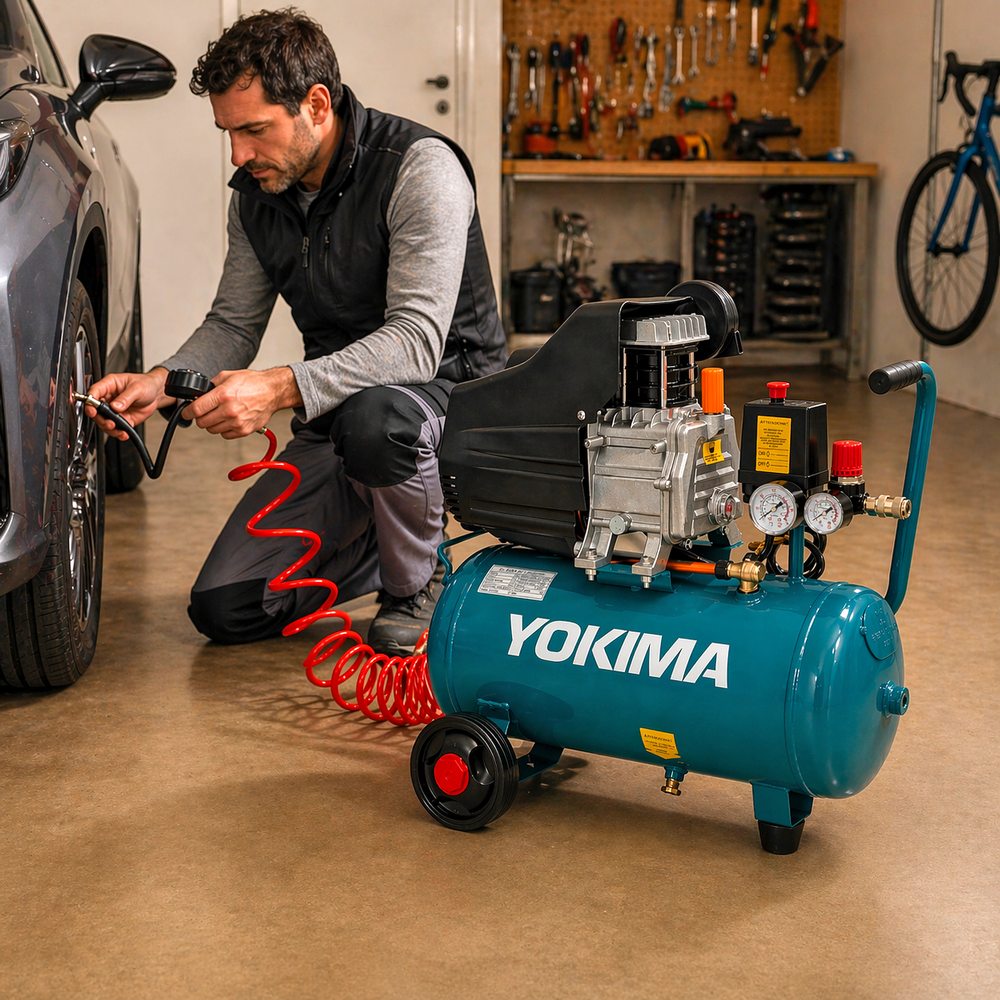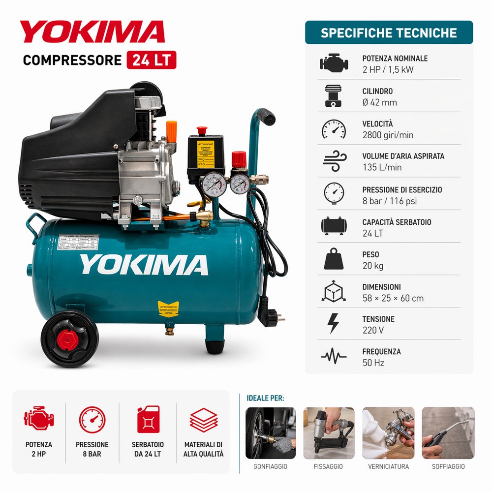 Serbatoio da 24 litri e pressione fino a 8 bar (116 psi) per prestazioni affidabili. Alimentazione 220V 50Hz, peso 19,4 kg e dimensioni 56x25x60 cm lo rendono pratico e facilmente trasportabile.